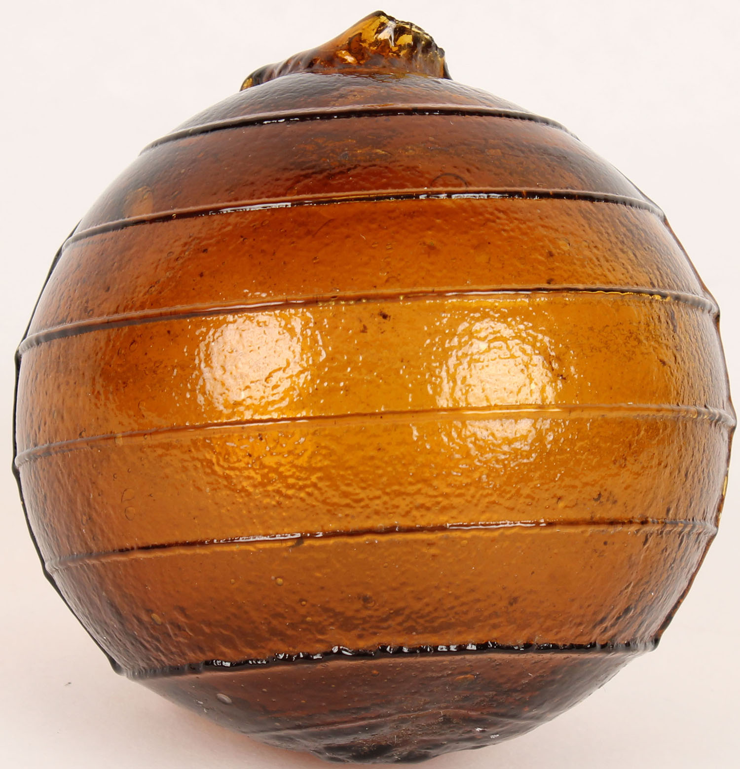 RARE! Tobacco amber Glass Target Ball, 3 piece mold, 7 horizontal rings, 2 3/4'' dia., low neck, circa 1880-1900. Grade: Excellent ++ - Value: 200 to 600