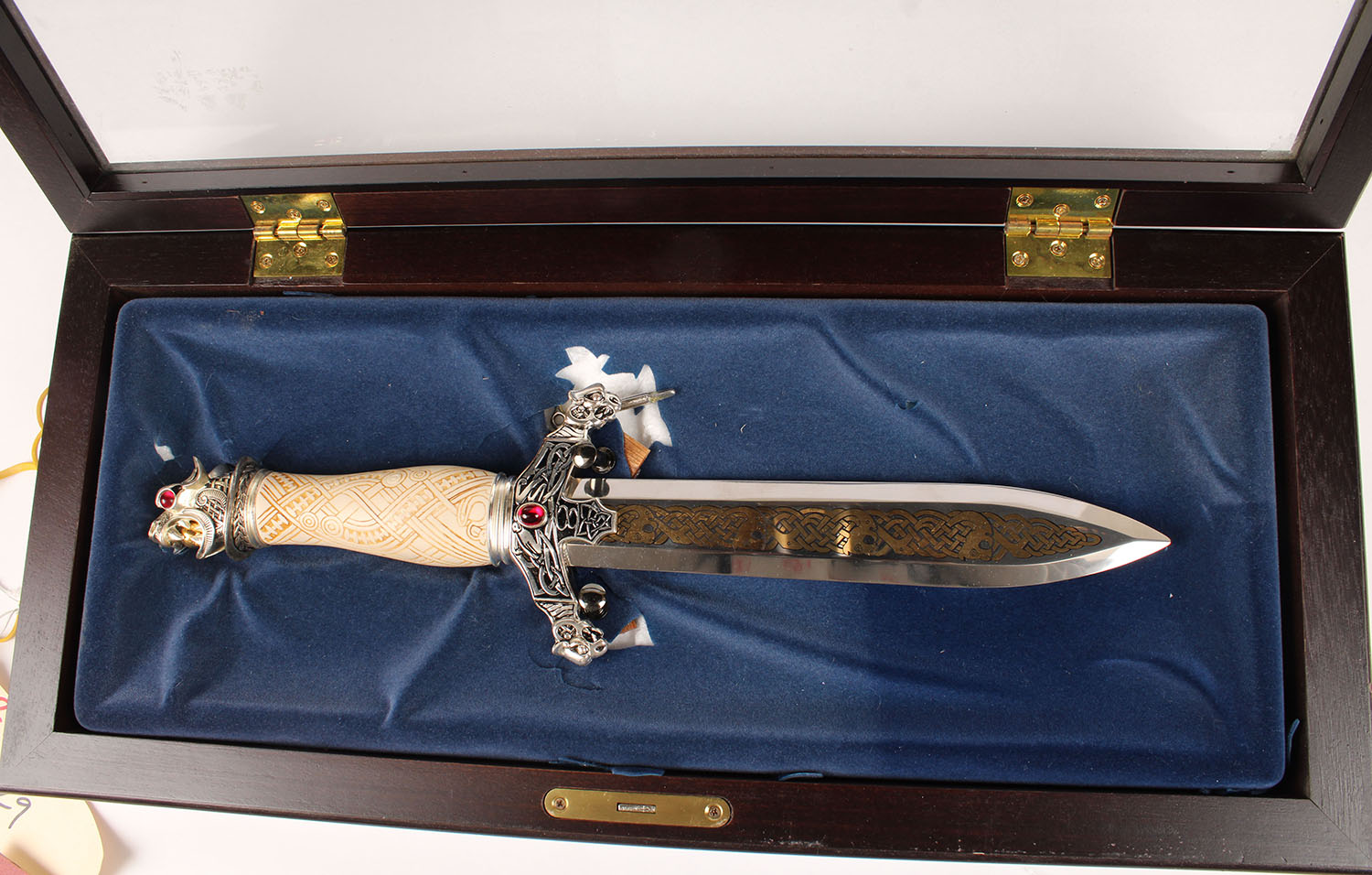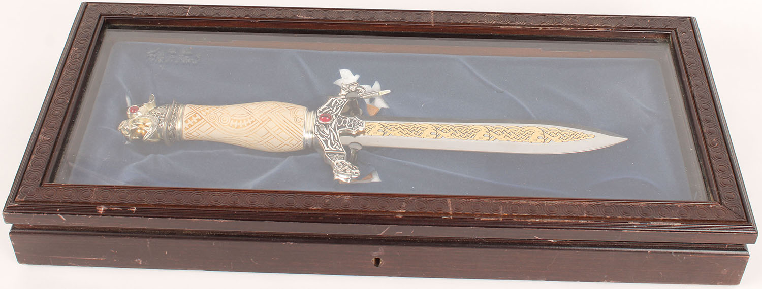 Franklin Mint Viking Knife, an authentic and original work of art by a world famous knife maker Sid Birt who has won the prestigious ''Best Knife Maker'' famous knife maker Sid Birt who has won the prestigious ''Best Knife Maker'' and Beretta Awards, Ornately sculptured and indirectly etched in tempered steel, 24 karat gold and sterling silver hand set with crystal cabochons. Comes in beautiful wood and glass display case with lock and key and has information and details about how the knife is made and where. Has certificate of authenticity inside case. Original cost in 1988 was $395. Grade: Excellent ++ - Value: 200 to 400