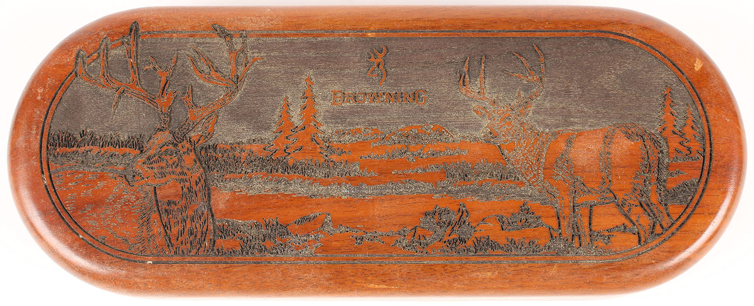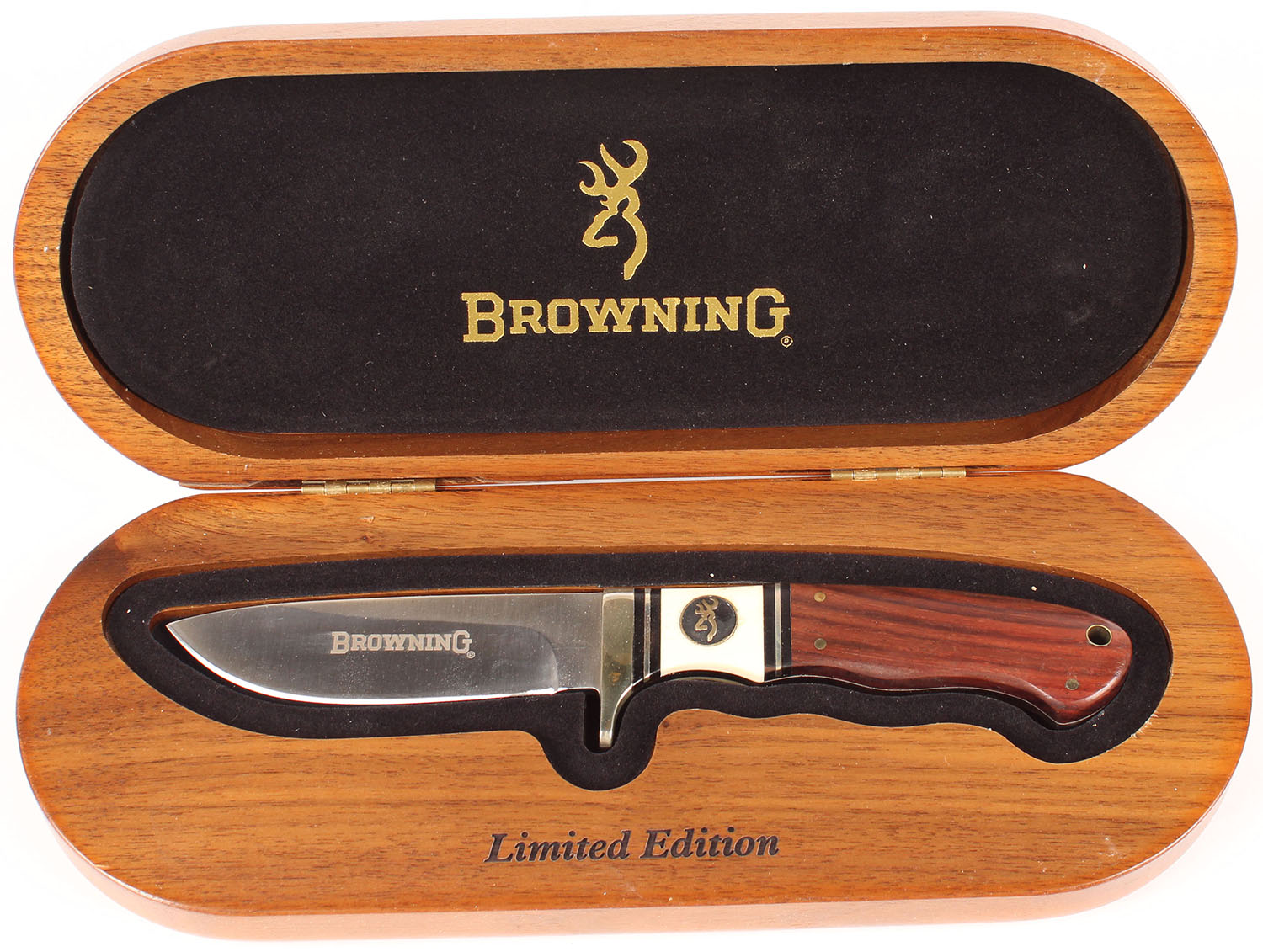 Browning LE knife in orginal wood box, 3 1/2'' blade, half hilt , wood handle, beautiful design to wood box. Grade: Excellent - Value: 30 to 90