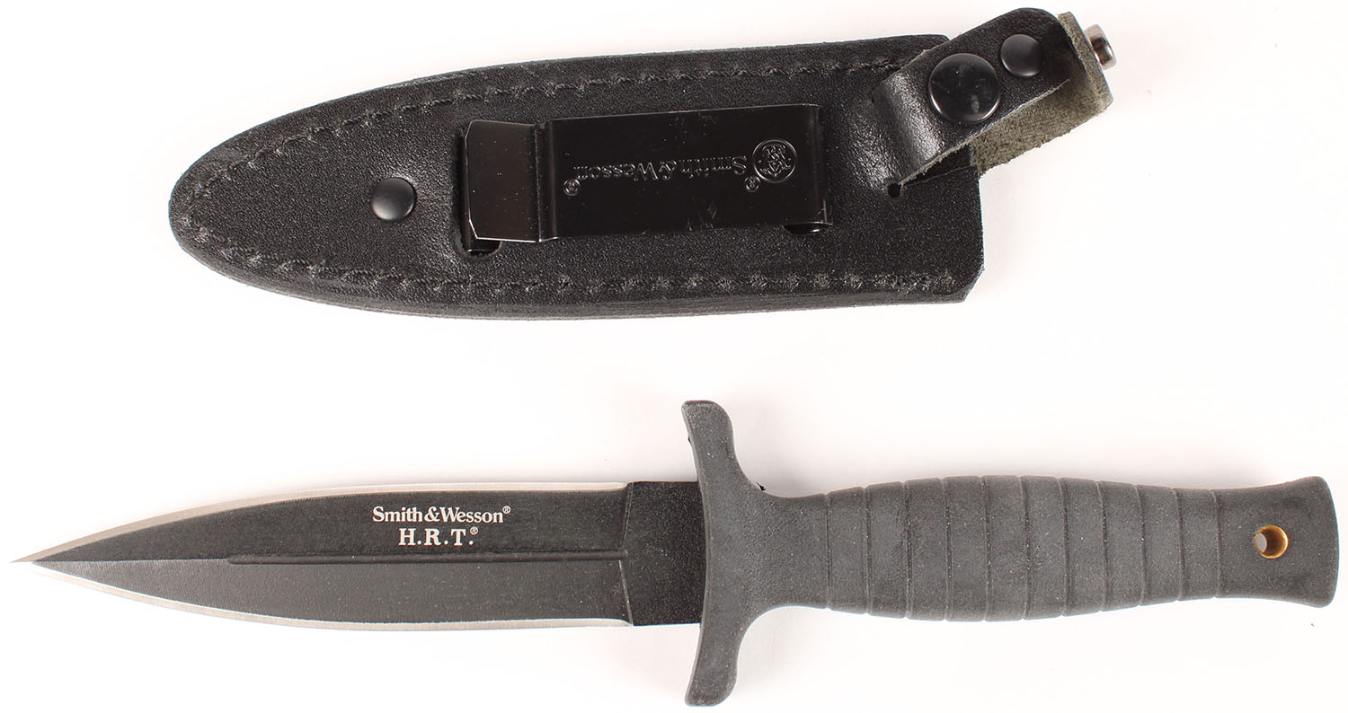 S&W fixed blade knife, with leather sheath and orginal box, all bright and clean. Grade: Excellent - Value: 20 to 60