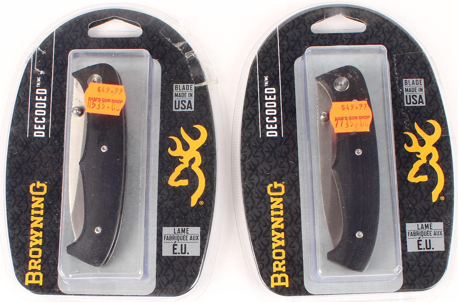 Lot of 2 browning Folding knives, Decoded, in new packaging. Grade: Excellent ++ - Value: 30 to 90