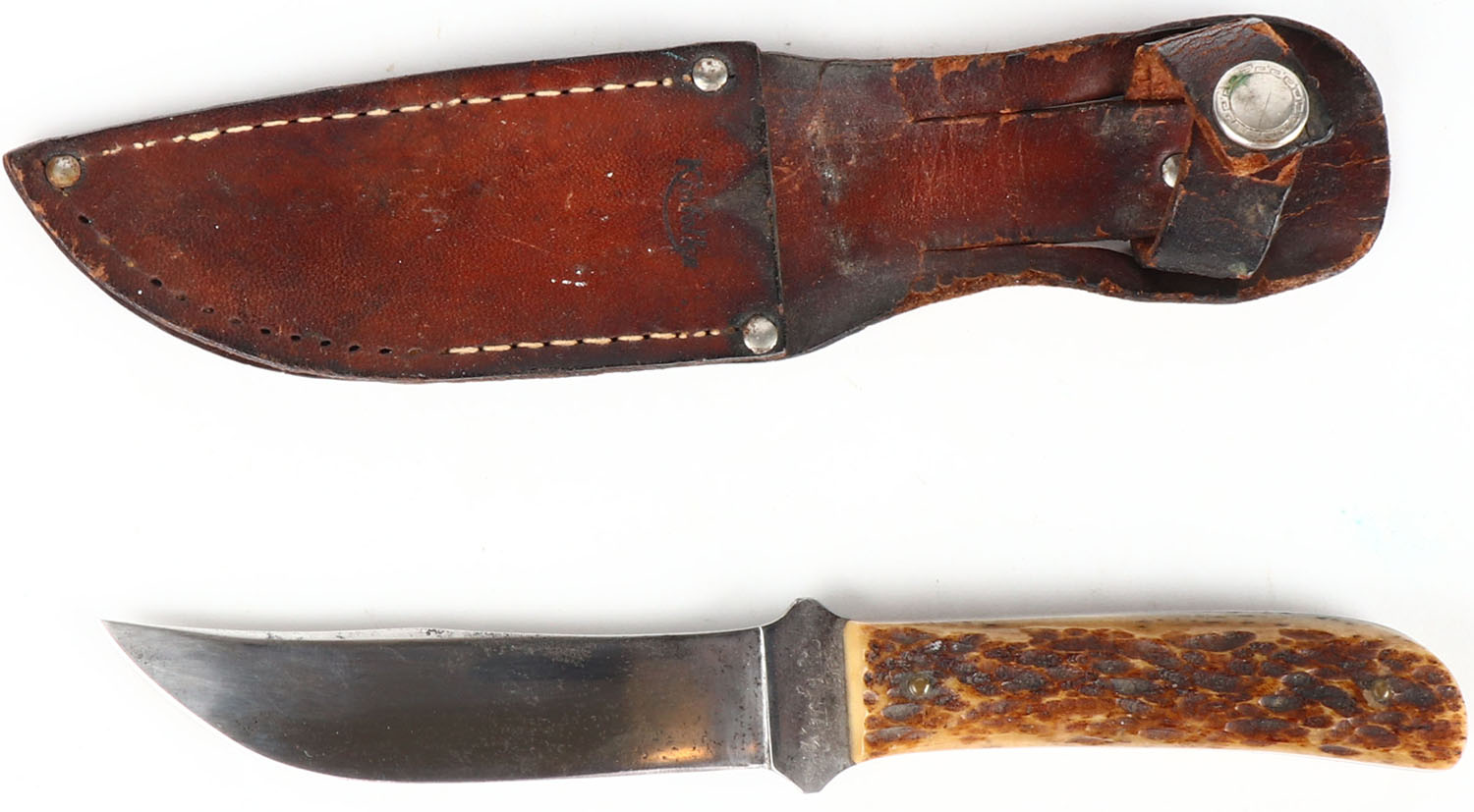 Kinfolks Inc. fixed blade knife, with leather sheath, has age soiling. Grade: Very Good - Value: 6 to 40