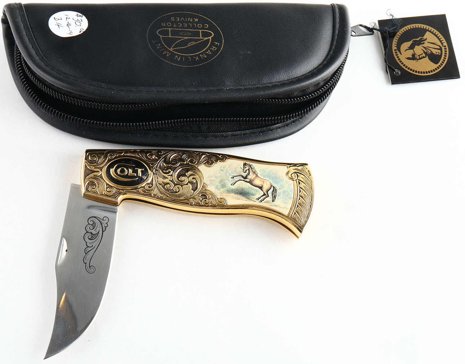 COLT knife by Franklin Mint collectors knives, 3'' folding blade knife, intricate design on handle, in orginal soft case, NIB. Grade: MINT - Value: 10 to 40
