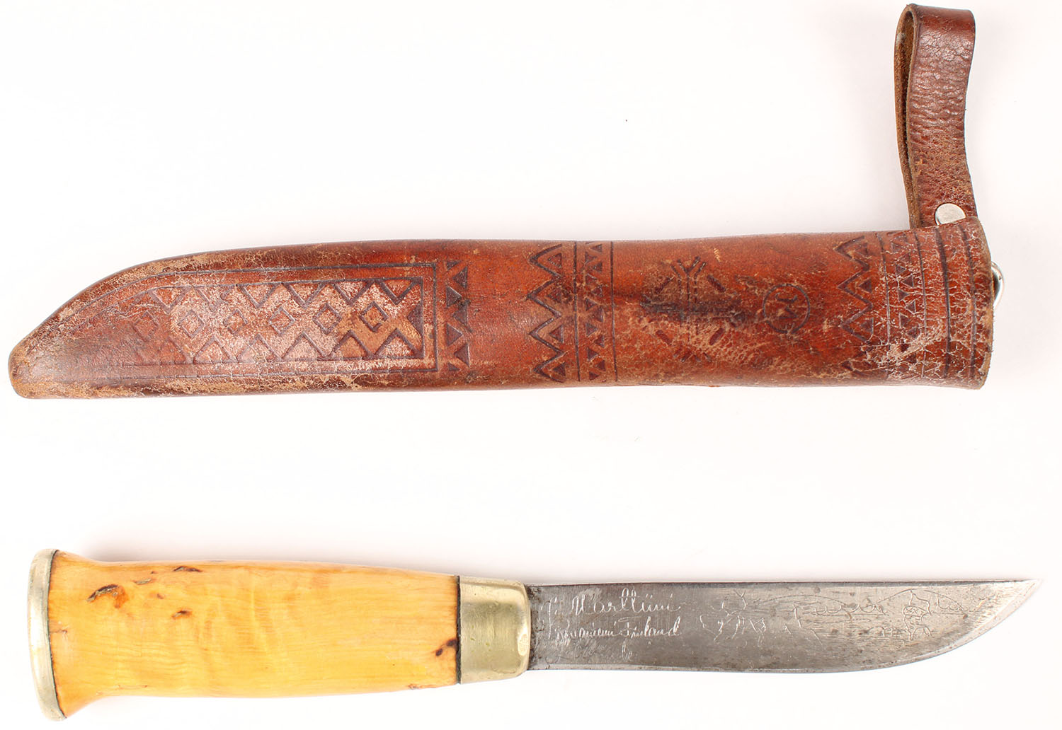 Made In Finland fillet knife, in orginal leather sheath, 4 1/4'' blade, has some age soiling. Grade: Very Good ++ - Value: 20 to 80