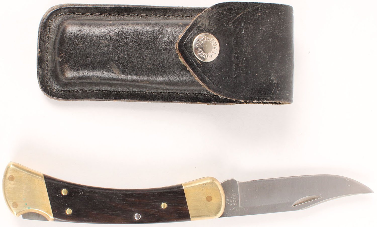 Buck folding knife, #110 x, 3 1/2'' blade, has leather sheath, all solid. Grade: Very Good ++ - Value: 16 to 60