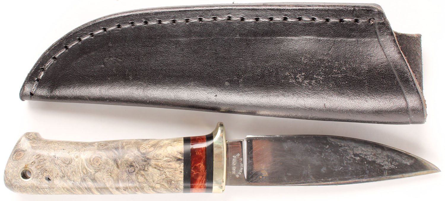 R.P. Jensen fixed blade knife, has original leather sheath, beautiful handle, some soiling to blade. Grade: Very Good ++ - Value: 16 to 60