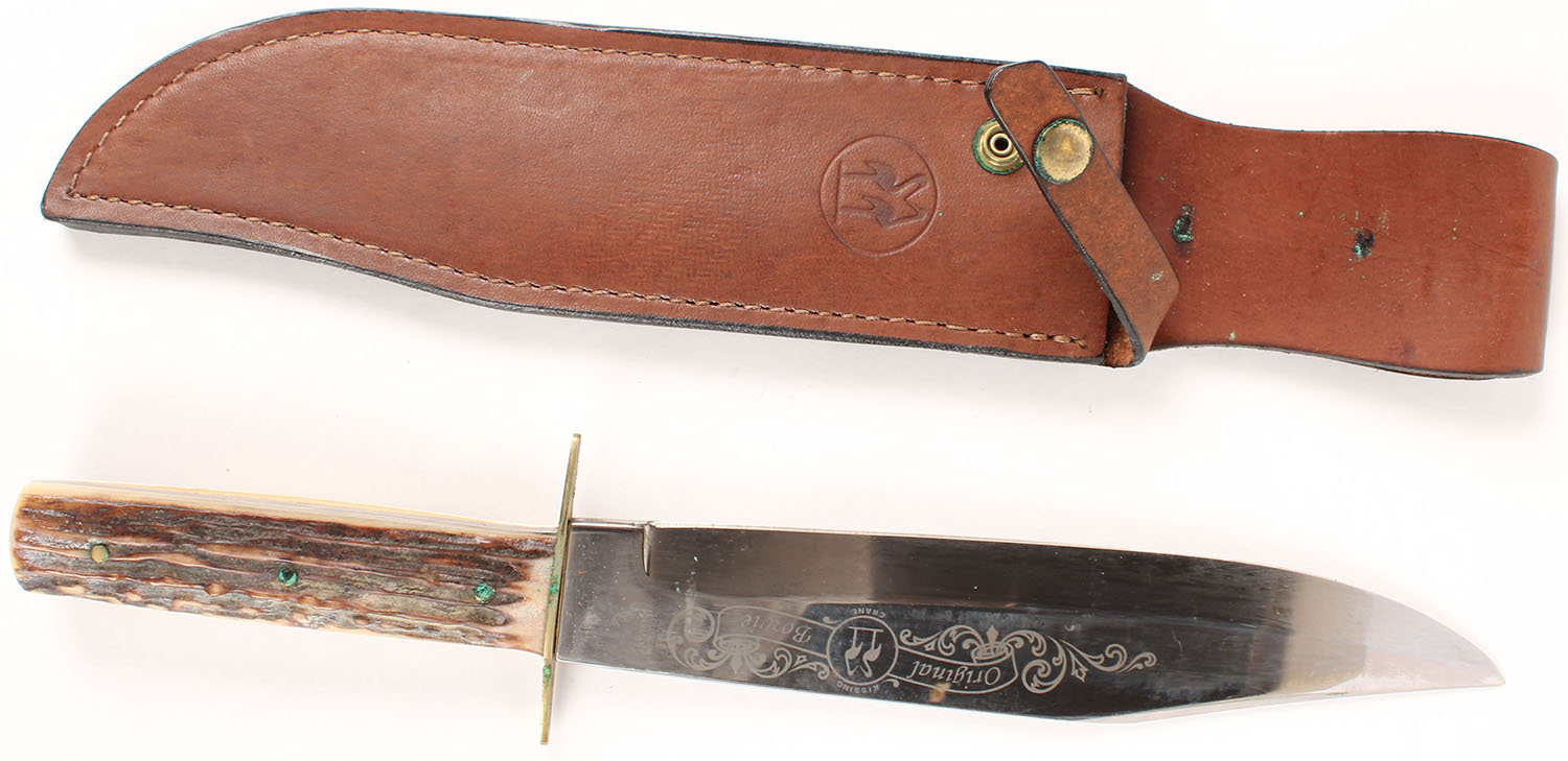Very Large Kissing crane Bowie knife, has leather sheath, 9'' blade, has age soiling. Grade: Very Good ++ - Value: 100 to 400