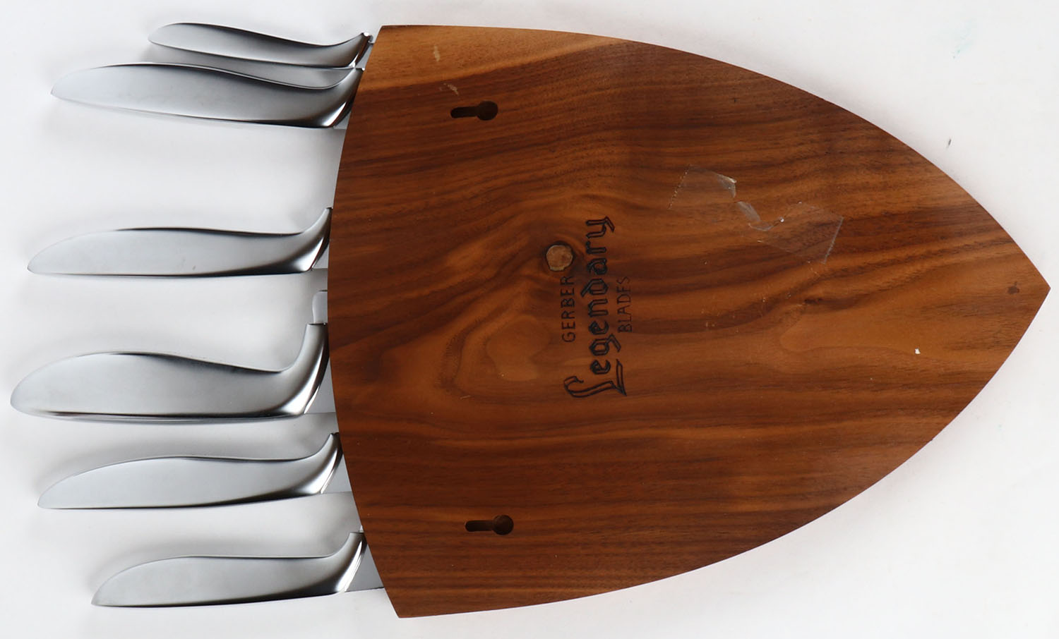 Gerber legendary knife display set, 6 knife, all bright and clean. Grade: Excellent ++ - Value: 50 to 250
