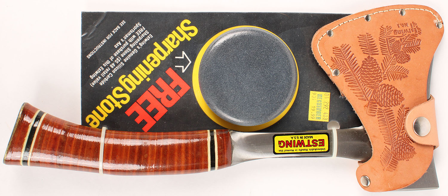 Estwing hatchet, NEW with leather cover and sharpening stone, all in orginal packaging. Grade: Excellent ++ - Value: 50 to 200