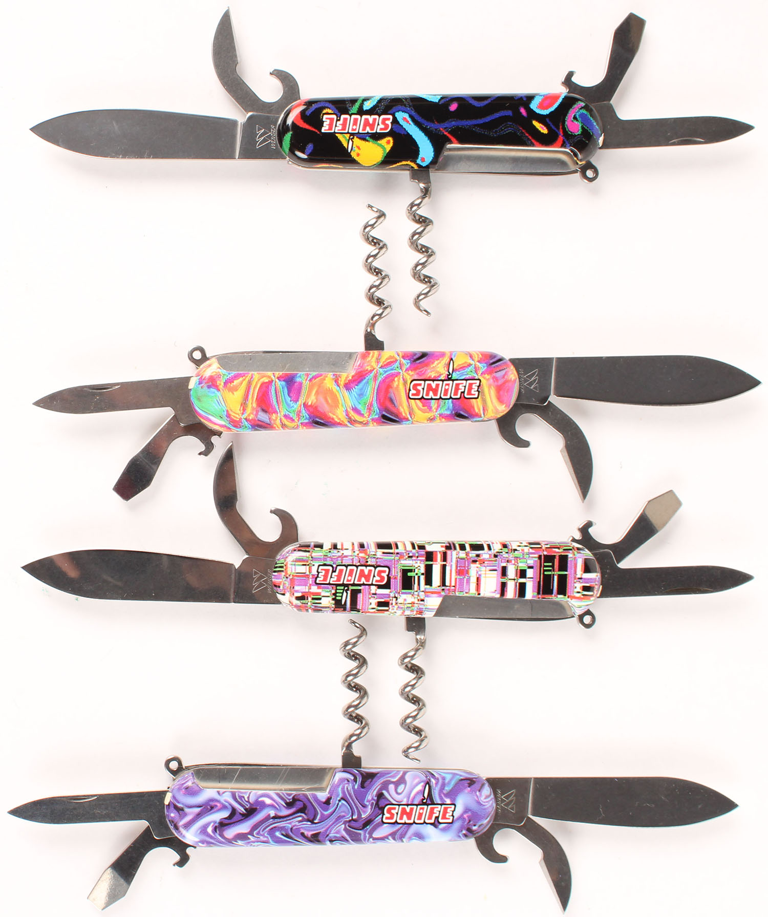 Lot of 4 Swiss Army SNIFE knives, folding knives, in orginal boxes, 4 different colors, all bright and clean! Grade: Excellent ++ - Value: 50 to 300