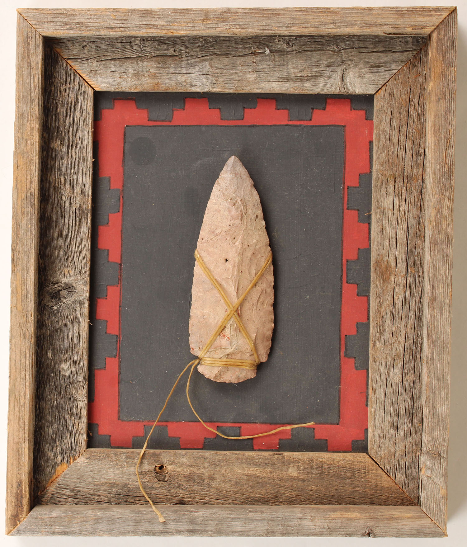 Large spear point, 6'' OAL, displayed on wood frame(Frame: 14'' x 12''. Grade: Excellent - Value: 100 to 500