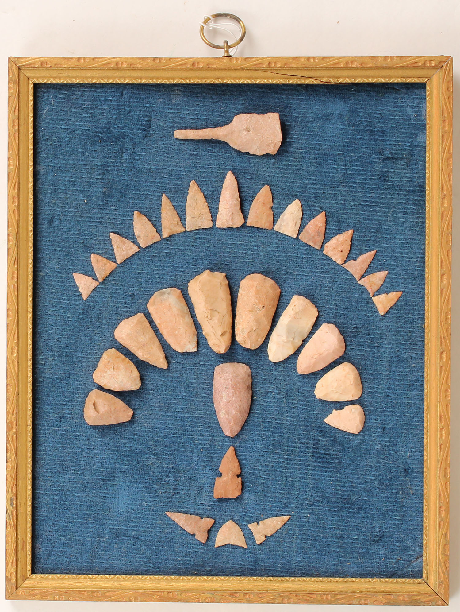 Large lot of arrow heads, all displayed on a wood frame(10'' x 9'') . Grade: Excellent - Value: 20 to 100