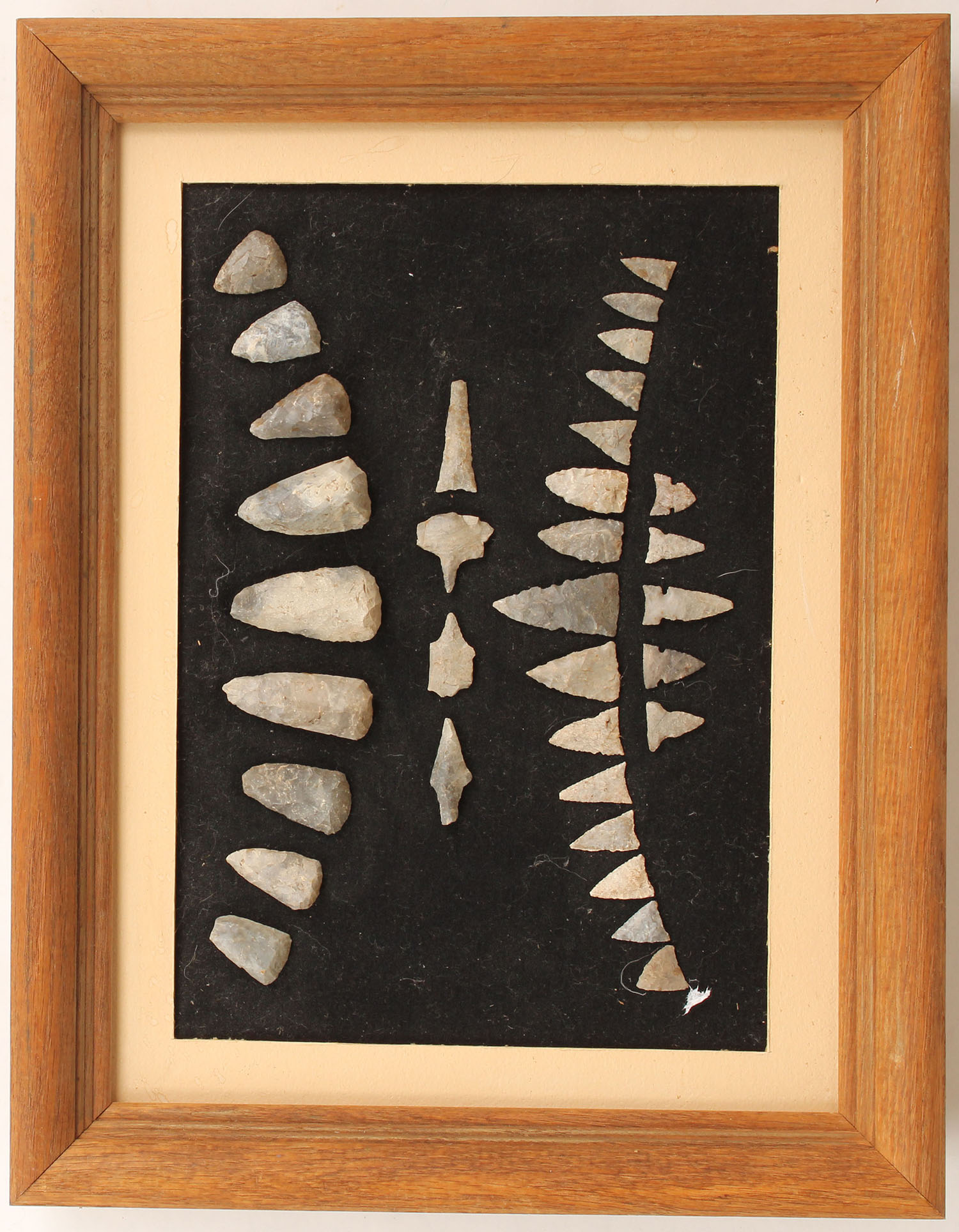 Large lot of arrow heads, all displayed on a wood frame(16'' x 12''). Grade: Excellent - Value: 20 to 100