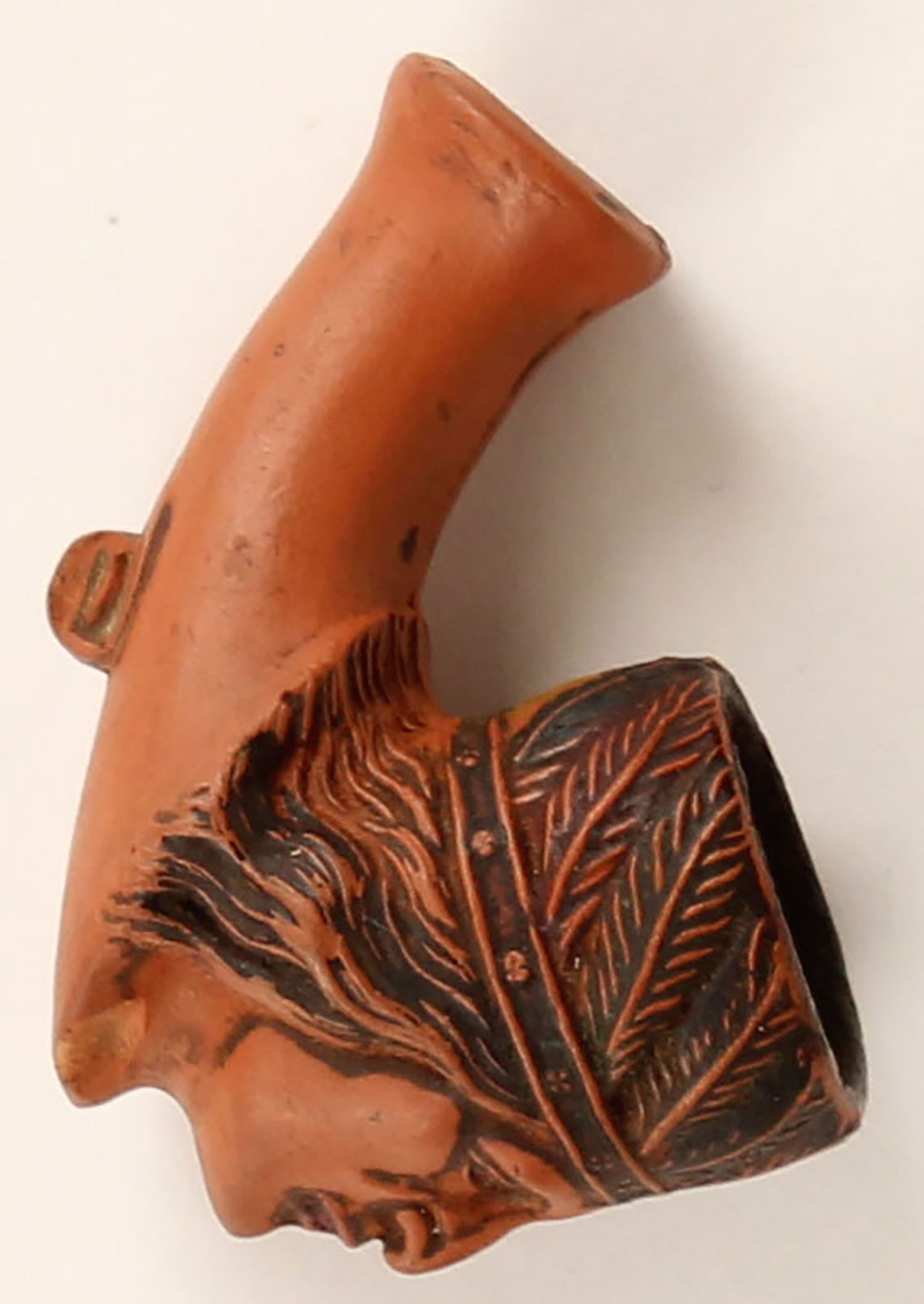 Clay pipe bowl with Chiefs head, found by Geo. Jelenik during and archaeological dig in Kansas. Grade: Excellent ++ - Value: 10 to 100