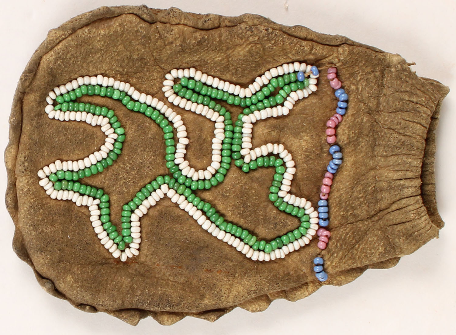 Leather beaded pouch, has age soiling, 3'' x 4''. Grade: Excellent - Value: 20 to 200