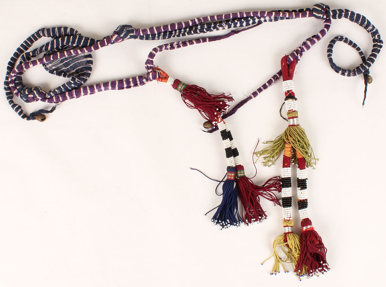 Beautiful cloth necklace with various beads on the end, multi colored, Grade Excellent - Value: 10 to 100