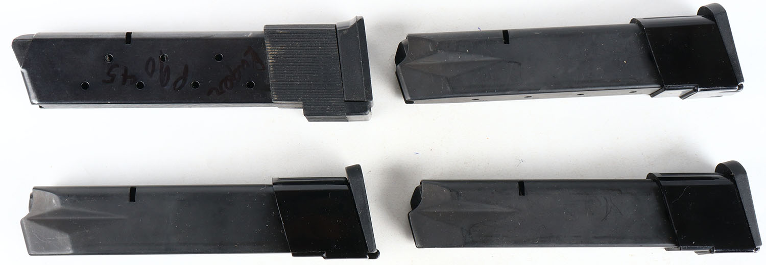 Lot of 4, 3 9mm 20 rd mags and 1 Ruger P90 45 cal mag. Grade: Excellent - Value: 20 to 80