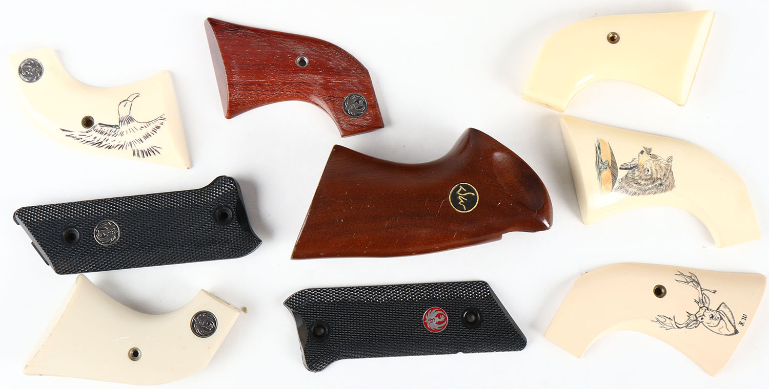 Large lot of pistol grips, 4 complete grips, 4 other piece of just 1 side. Grade: Excellent - Value: 10 to 50