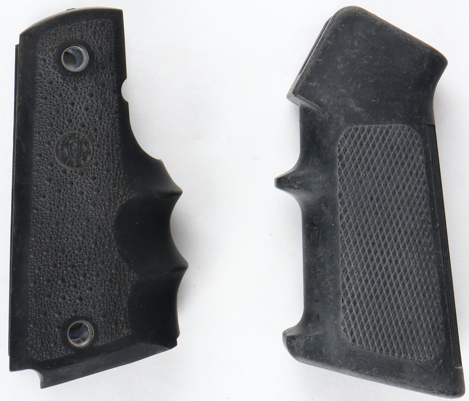 Lot of 2, 1 unmarked grip and 1 Hogue rubber pistol grip. Grade: Excellent - Value: 2 to 20