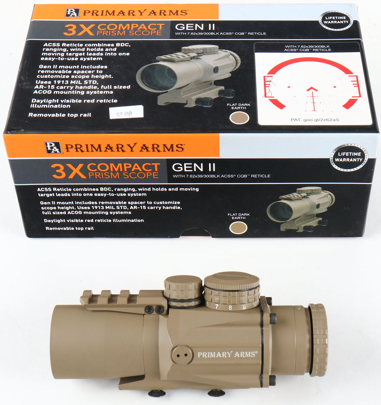 PA 3x compact prism scope GEN II in orginal box, with 7.62x39/300blk ACSS CQB Reticle, New in box. Grade: Excellent ++ - Value: 100 to 400