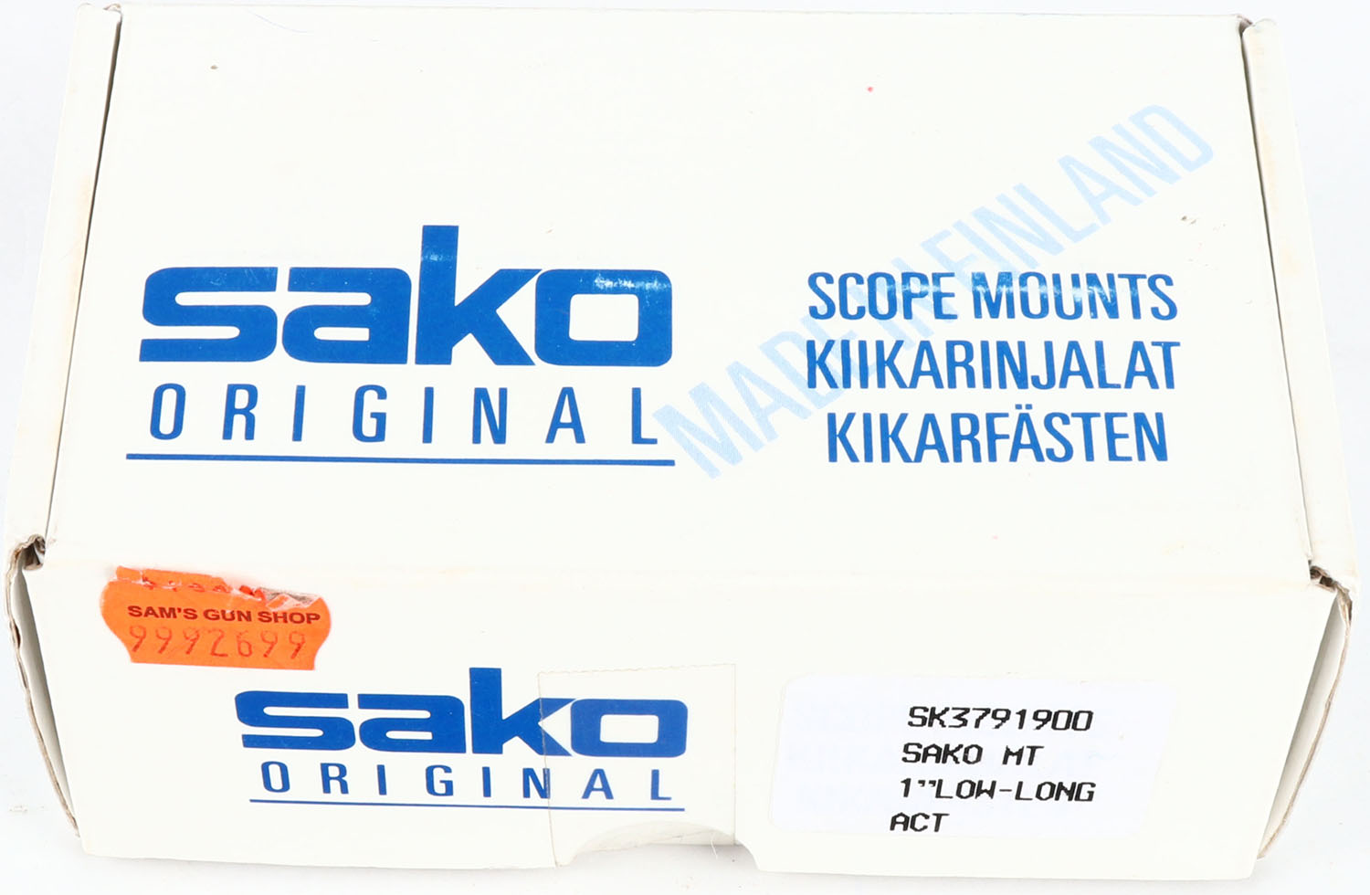 Sako MT 1'' Low-long scope mount, in original box. Grade: Excellent - Value: 4 to 40