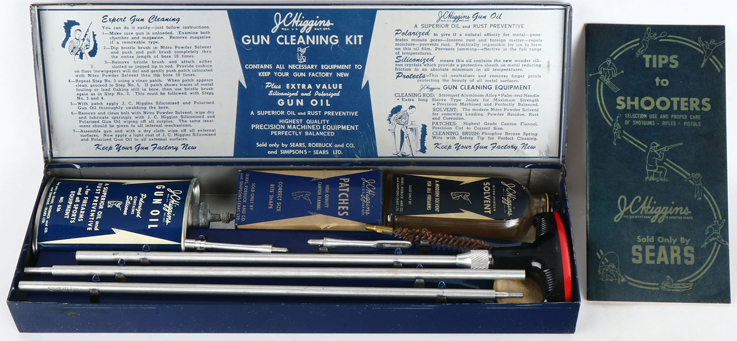 Sears J.C. Higgins Shotgun Cleaning kit, No. 710, has glass oil & solvent bottle, missing one rod. Grade: Excellent - Value: 6 to 30