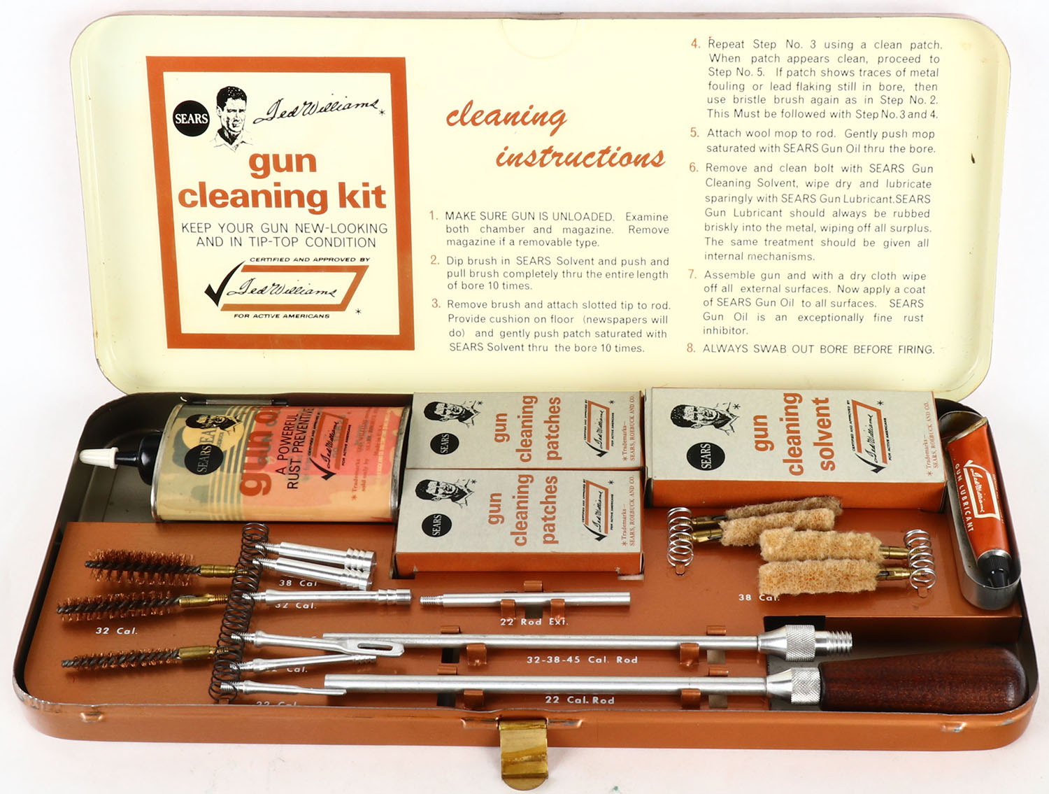 Sears Ted Williams Rifle Cleaning Kit, .22, 32-38-45 cal., oil tin & solvent bottle. Grade: Excellent - Value: 10 to 50