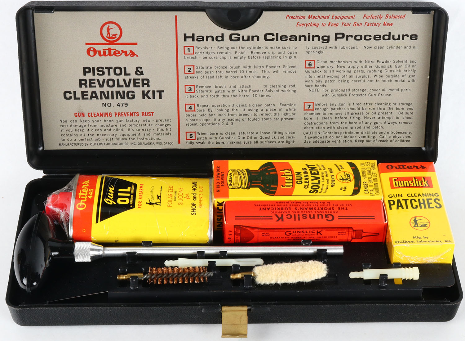 Outers Pistol Cleaning Kit, No. 479, oil tin & solvent bottle. Grade: Excellent - Value: 10 to 50