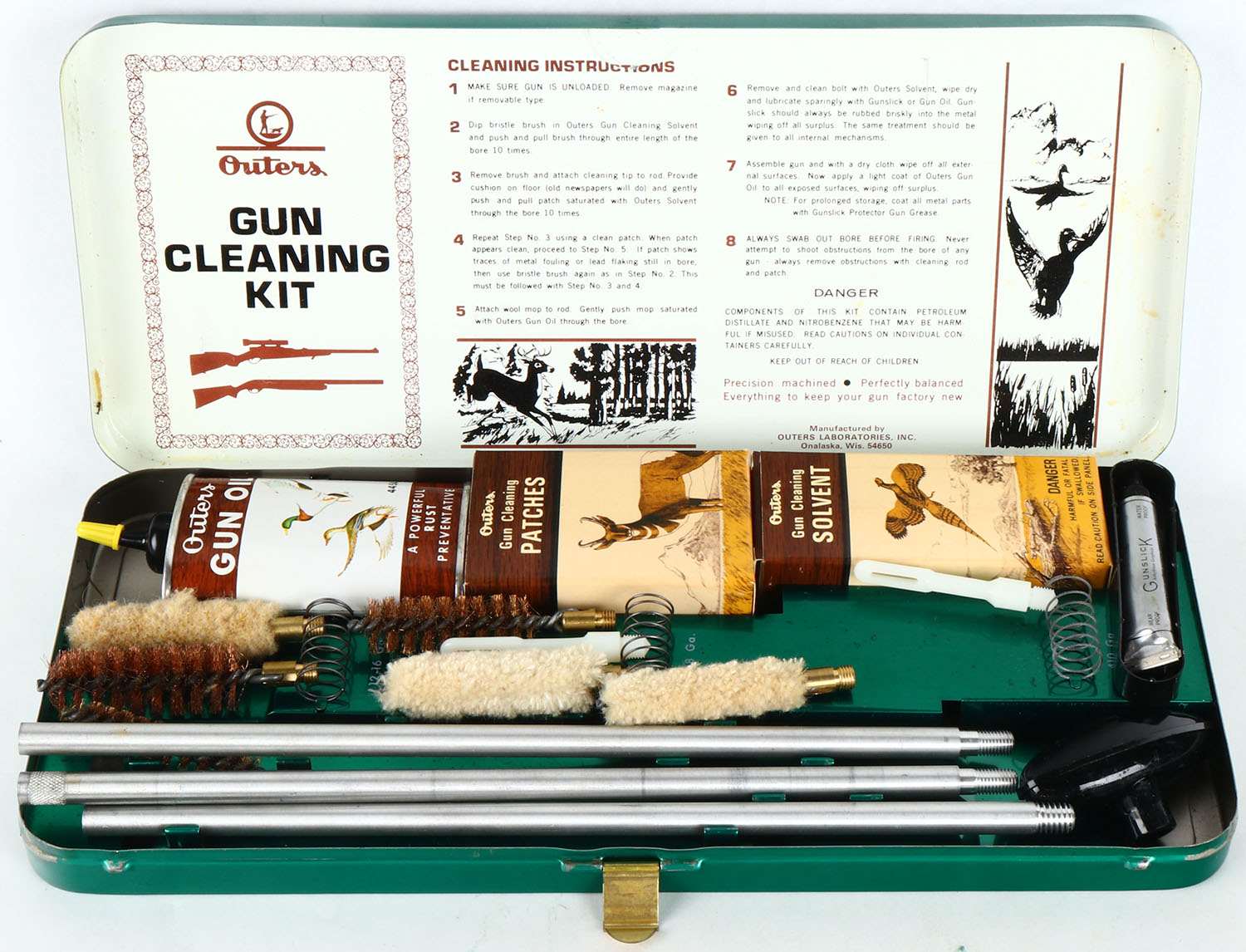 Outers Shotgun Cleaning Kit, No. 378, oil tin & solvent bottle. Grade: Excellent - Value: 10 to 50