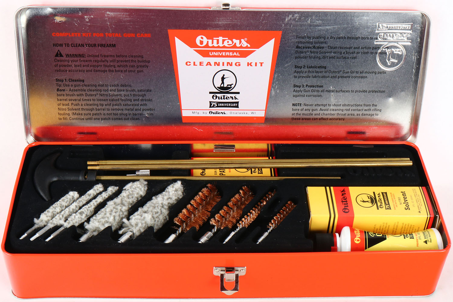 Outers 75th Anniversary Cleaning Kit, .22-shotgun, No. 98075, oil & solvent bottle. Grade: Excellent - Value: 6 to 30