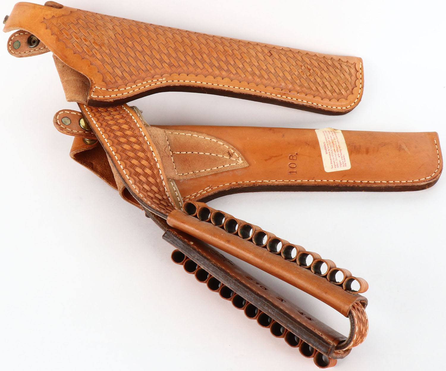 Tex Shoemaker & Sons leather cart belt and pistol holsters, holster marked 30Tb 40 and belt marked 40 and cart holders marked 210 A 44. Grade: Excellent ++ - Value: 30 to 90