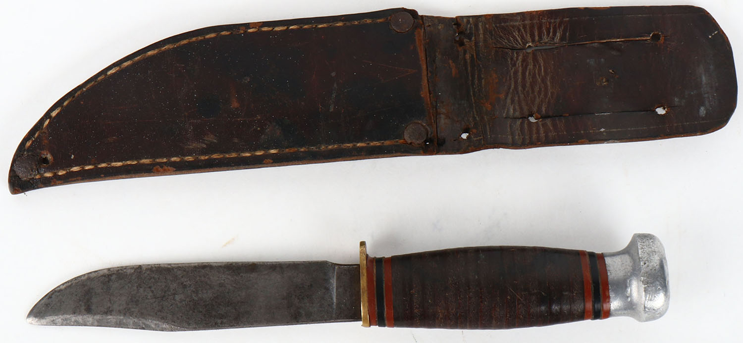 Marble's Knife, 4'' blade, half hilt, aluminum pommel, leather washer handle, has age soiling and scratches to blade, has unmarked leather sheath. Grade: Very Good - Value: 10 to 50