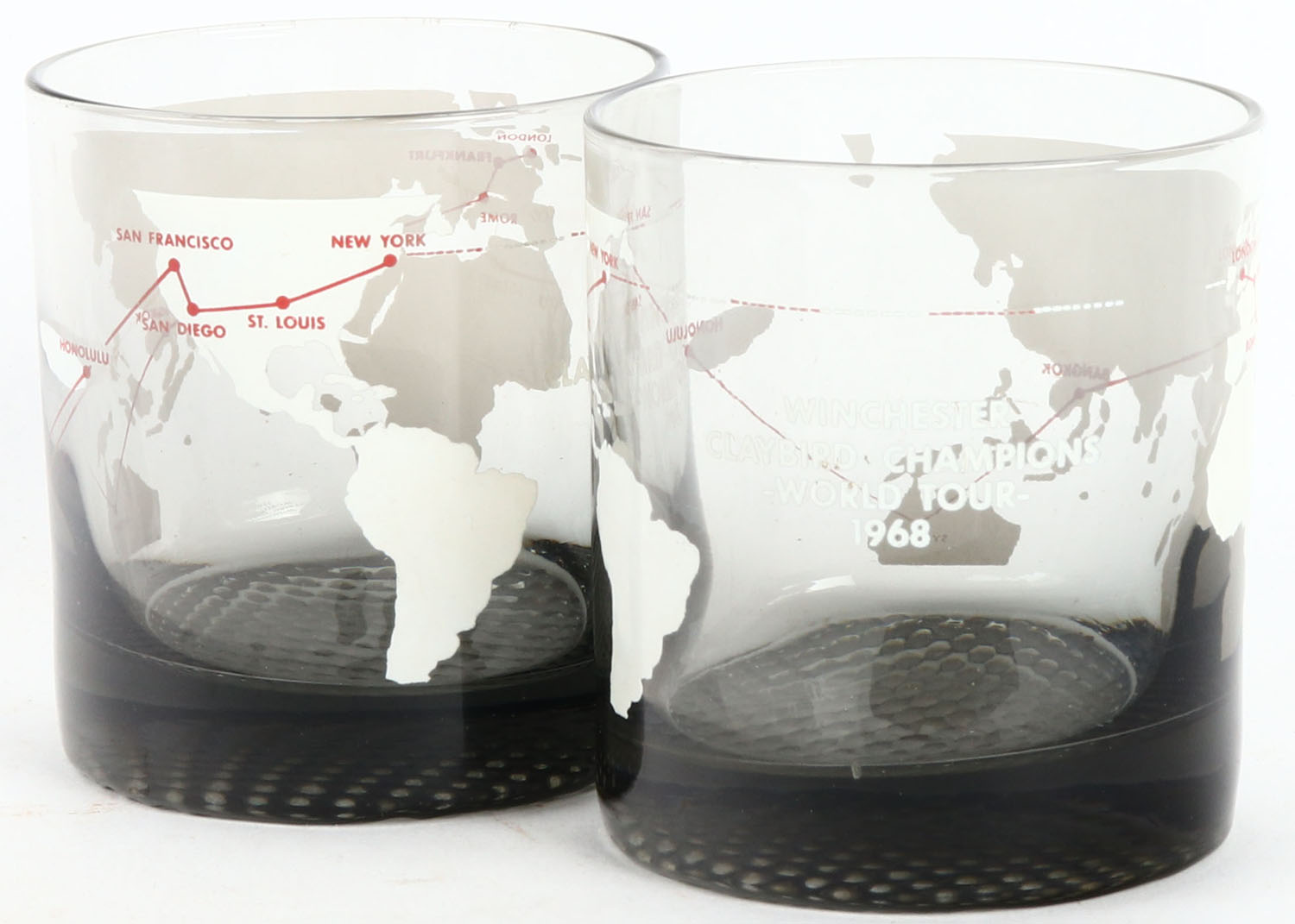 Lot of 2 Winchester High Ball Glasses, Claybird Champions, World Tour 1968, 3 1/8'' tall & 3'' at the mouth, has map of the world & shows all the city's they stopped in. Grade: Excellent ++ - Value: 10 to 100
