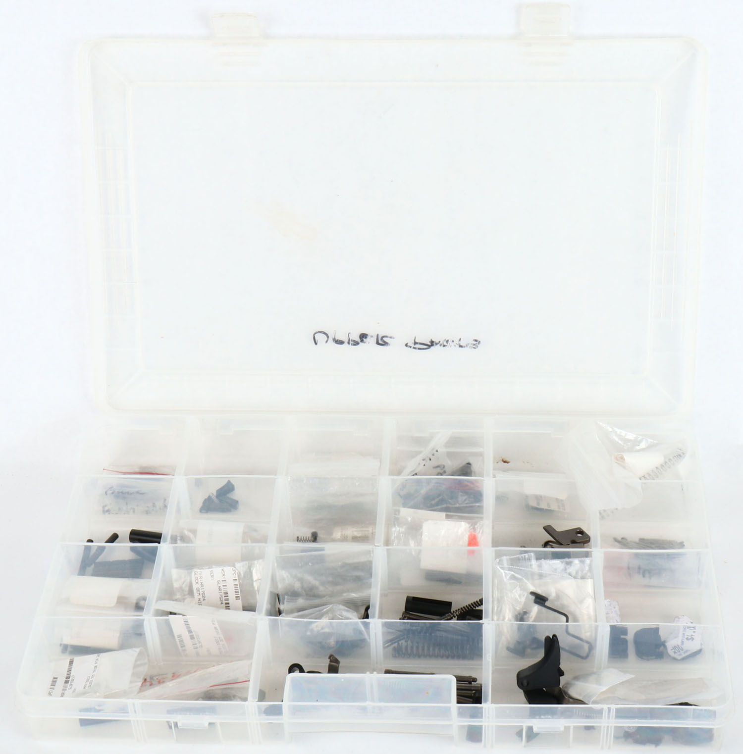 Large lot of gun parts in plastic container. Grade: MINT - Value: 10 to 100