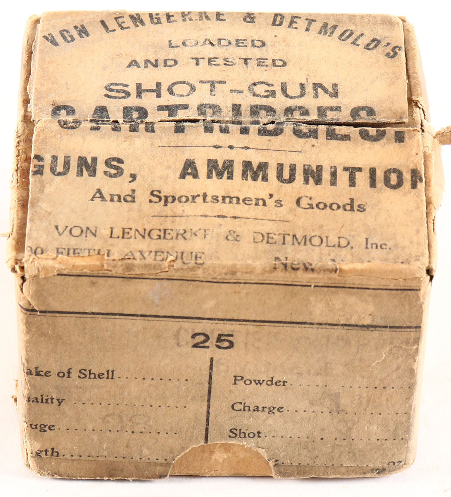 Von Lengerke & Detmold's, 28 ga, 2 pc., Full, shot size 7ch, buff box with black label, box has age soiling & scuffing. VERY RARE IN 28ga! Grade: Very Good + - Value: 200 to 600