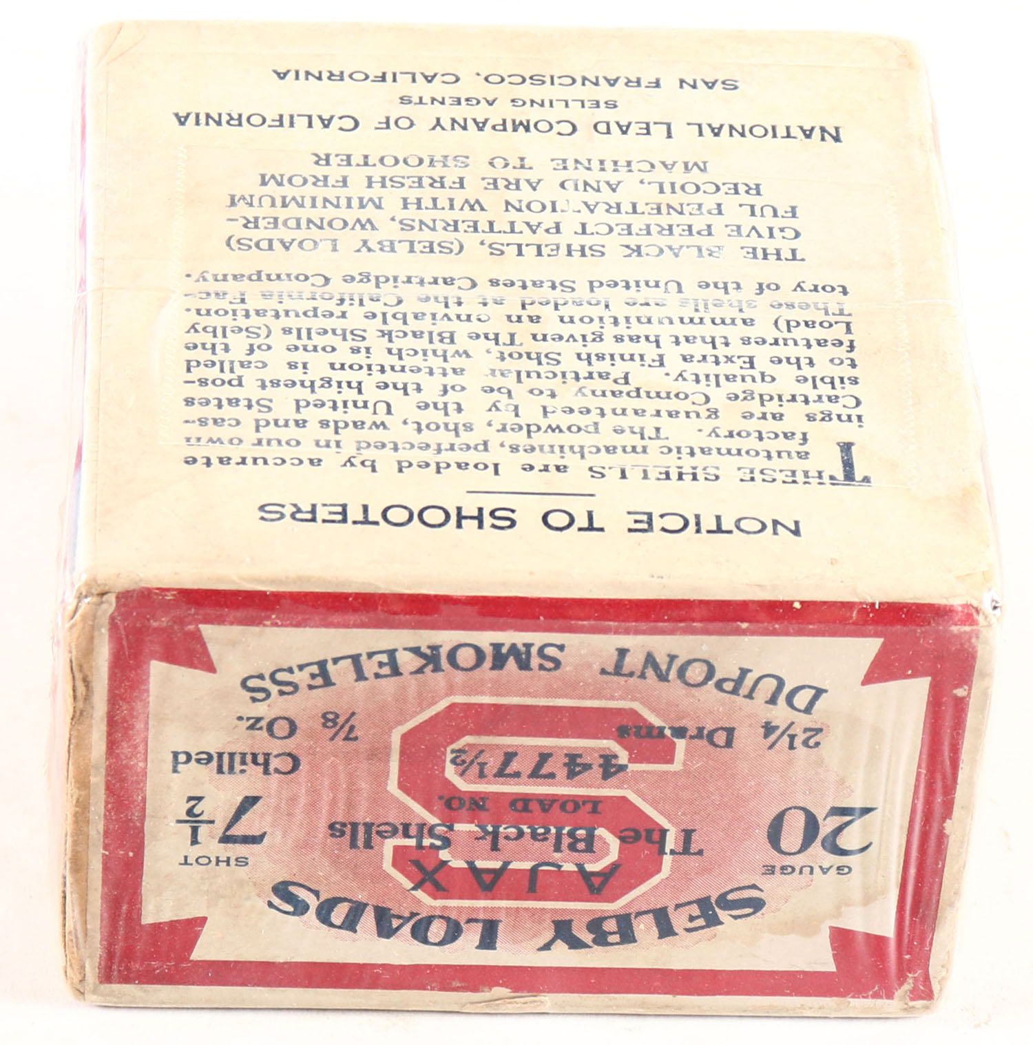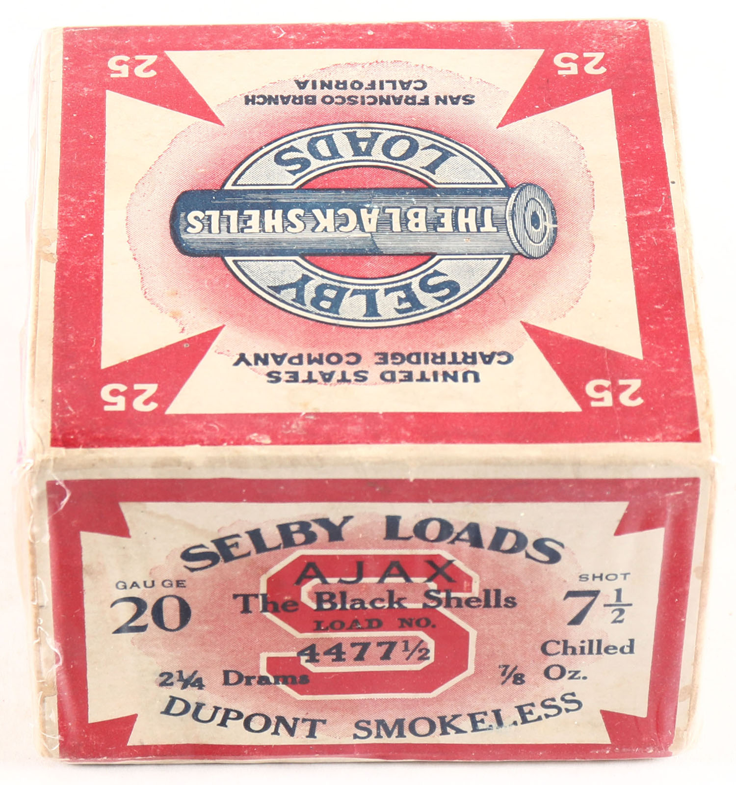 SELBY, U.S. Cartridge Co., AJAX The Black Shells, 20ga, 2pc., FULL & SEALED, shot size 7 1/2CH, 2 1/4 Drams, buff box with red, white & blue paper label with The Black Shells side label, box is solid with great colors, box has light age soiling. Grade: Excellent + - Value: 150 to 500