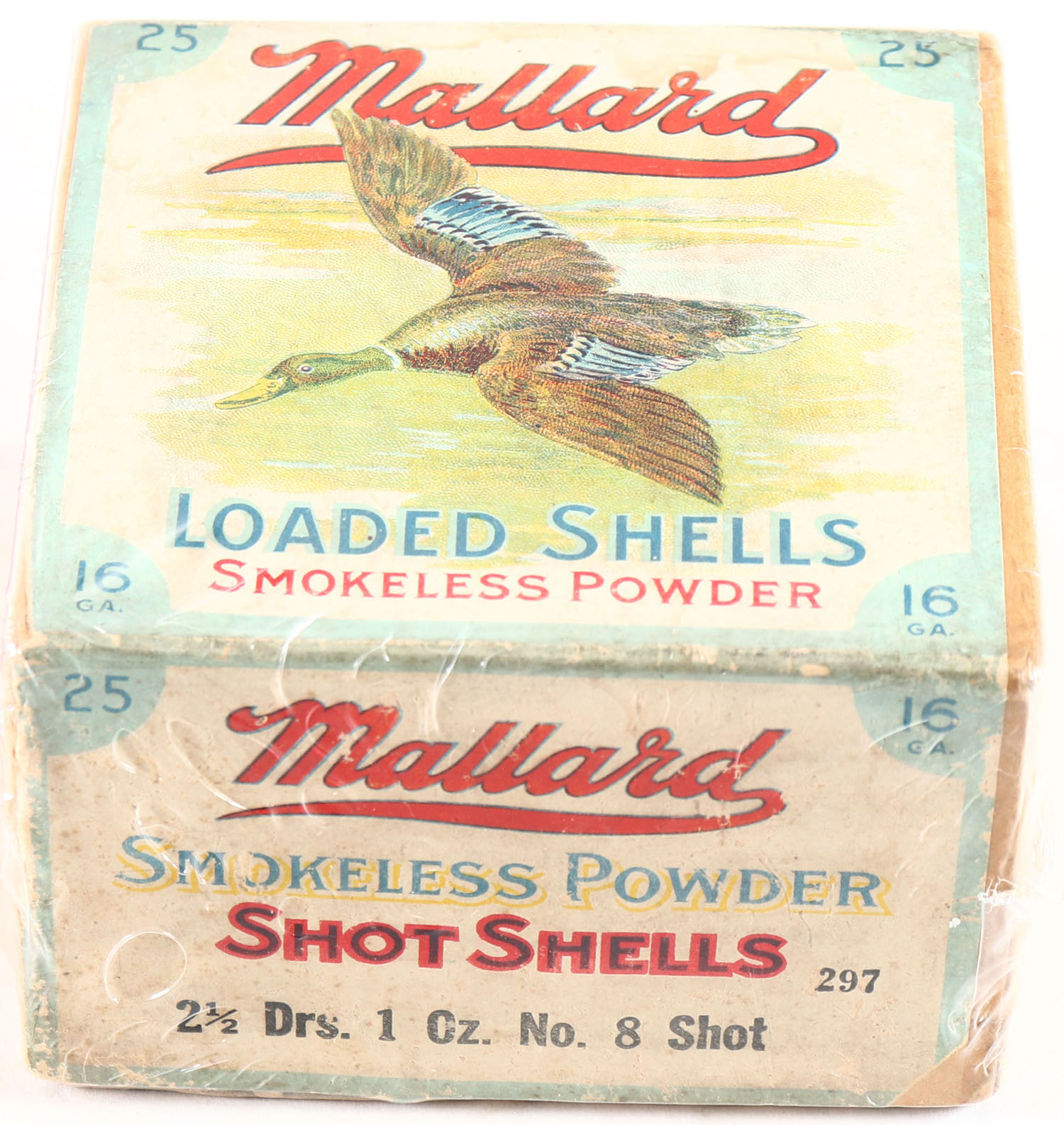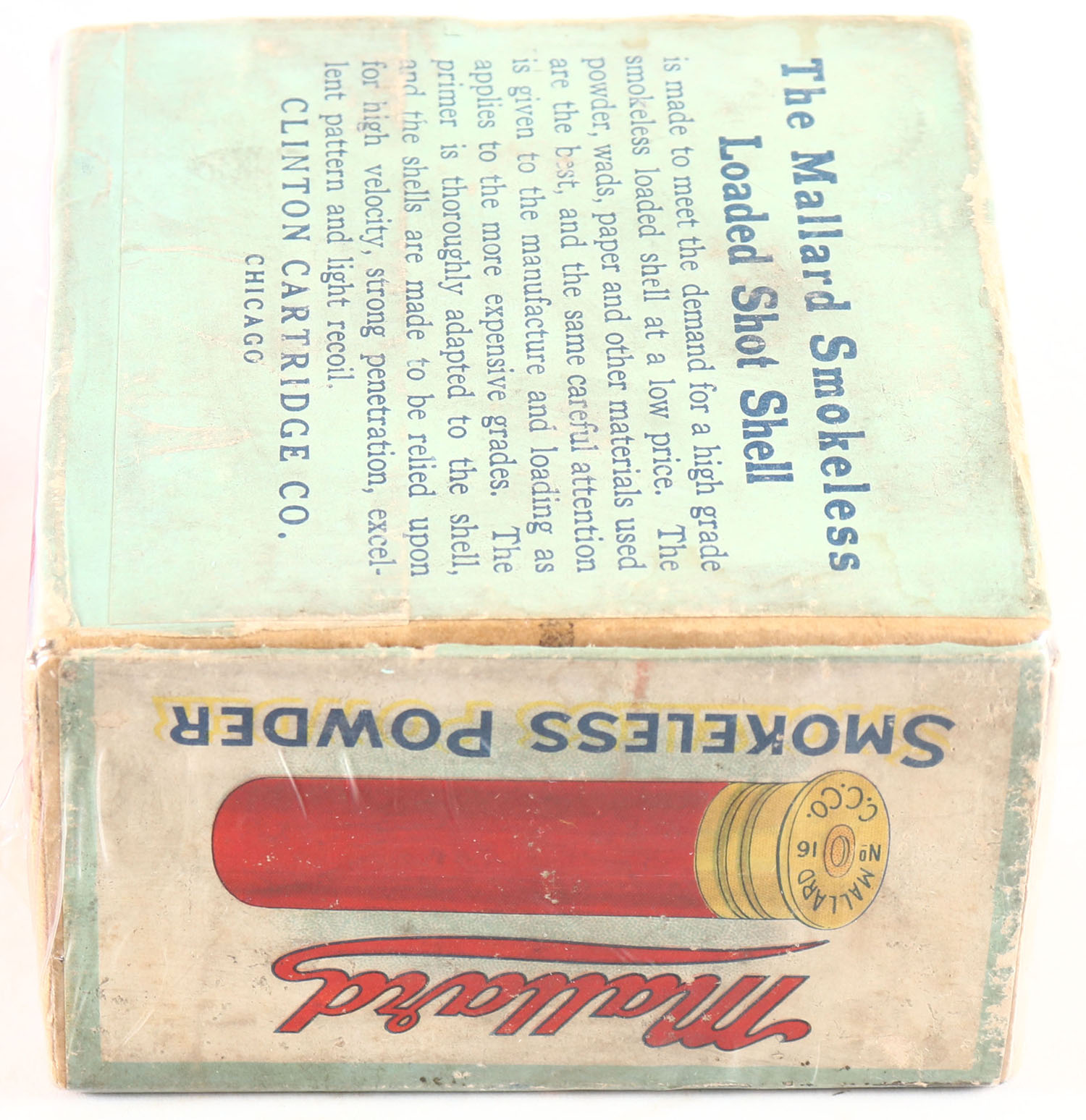 Clinton Cartridge Co., MALLARD, 16ga., 2pc., Empty, shot size 8, buff box with multi colored label picturing a Mallard flying left, 2 1/2 Drs. 1 Oz. No. 8 Shot, box has light age soiling with great colors. Grade: Excellent + - Value: 200 to 600