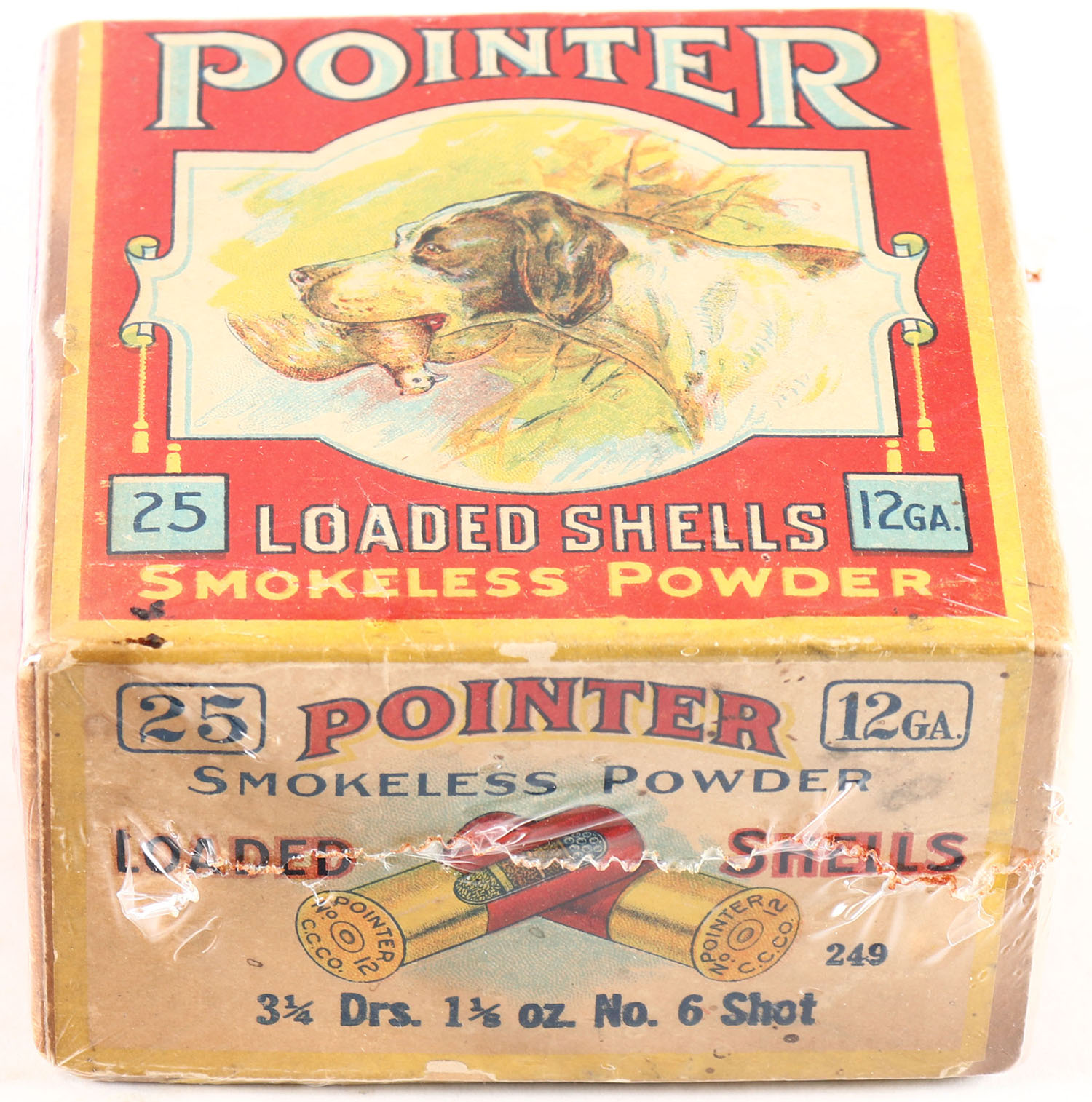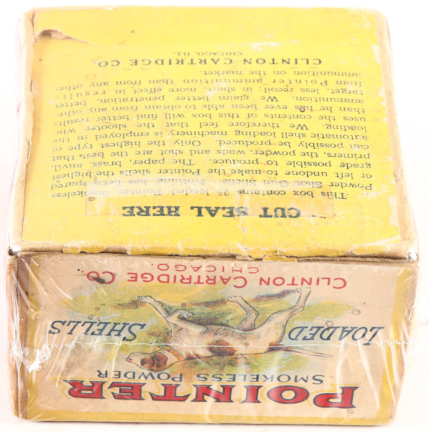 CLINTON Cartridge Co., POINTER, 12ga., 2pc., Empty, shot size 6, buff box with multi-colored label of a dog holding a quail, box has age soiling with light scuffing, sides picture crossed shells & a dog on point. Grade: Excellent - Value: 100 to 250
