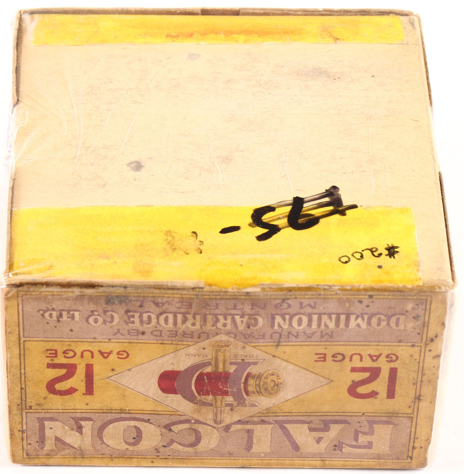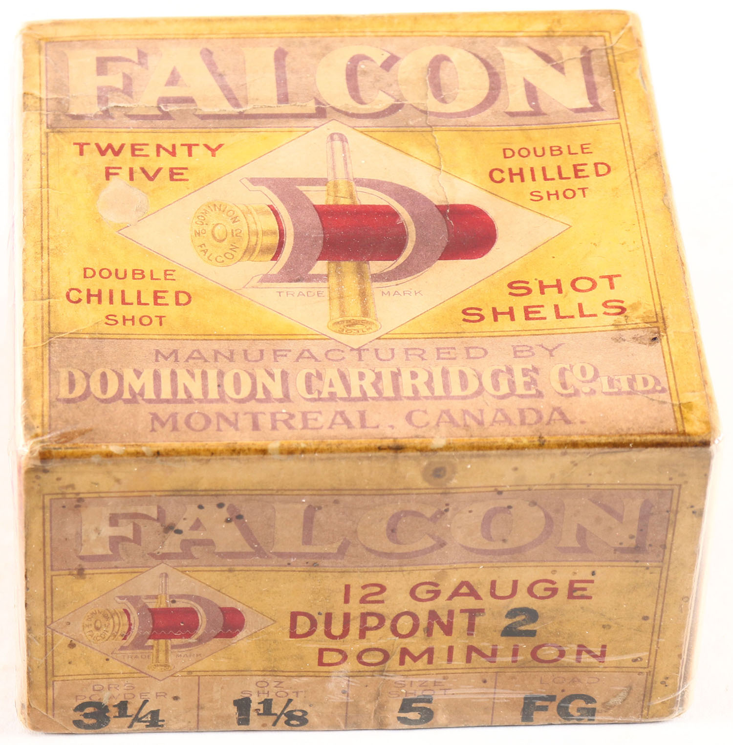 RARE Dominion Cartridge Co, Falcon, 12ga., 2pc., Empty, shot size 5, has early Bent D Logo, box is solid with good color to label, box has soiling & scuffing. Grade: Very Good - Value: 100 to 300