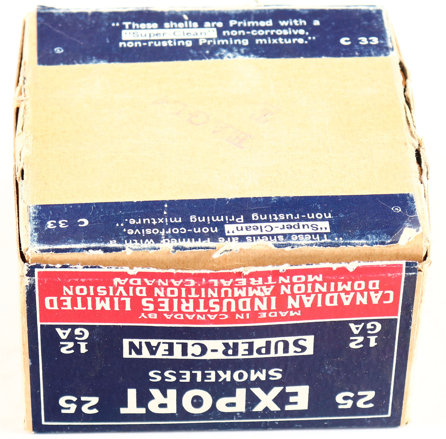 RARE Dominion Cartridge Co, EXPORT, 12ga., 2pc., Full, shot size 6, box is very solid with great color to label. Bottom has shell protrusions, Shells are excellent. Grade: Excellent - Value: 100 to 500