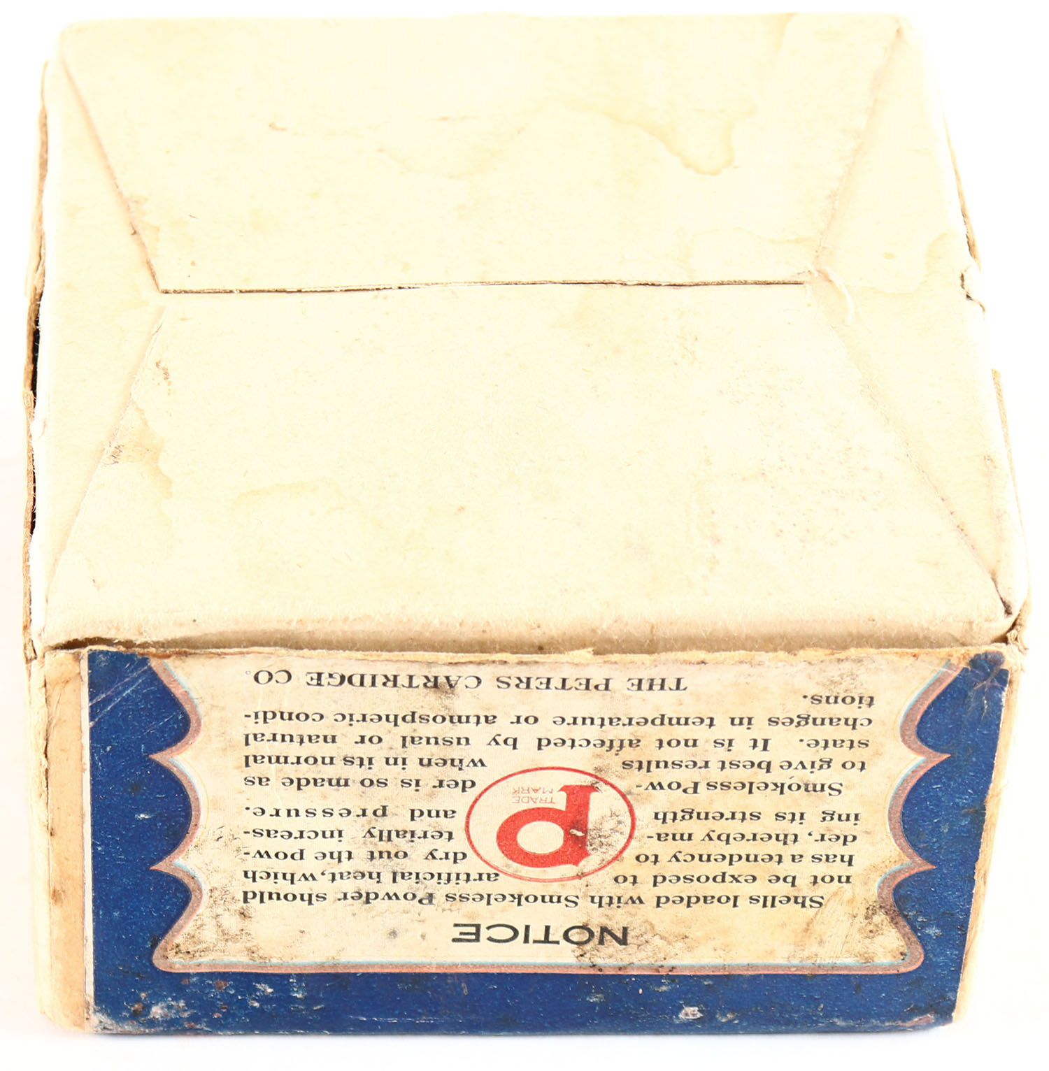 Peters Cart. Co., HIGH GUN, 10ga, 2pc., Full of High Velocity Shells, shot size 4, buff box with multi colored picture of Snipe, Loading: No. N 1024, 32 Grs., 1 1/4 Oz. No. 4 Shot, Ballistite Smokeless, box has a seam split, label is very good. Grade: Very Good ++ - Value: 500 to 2000
