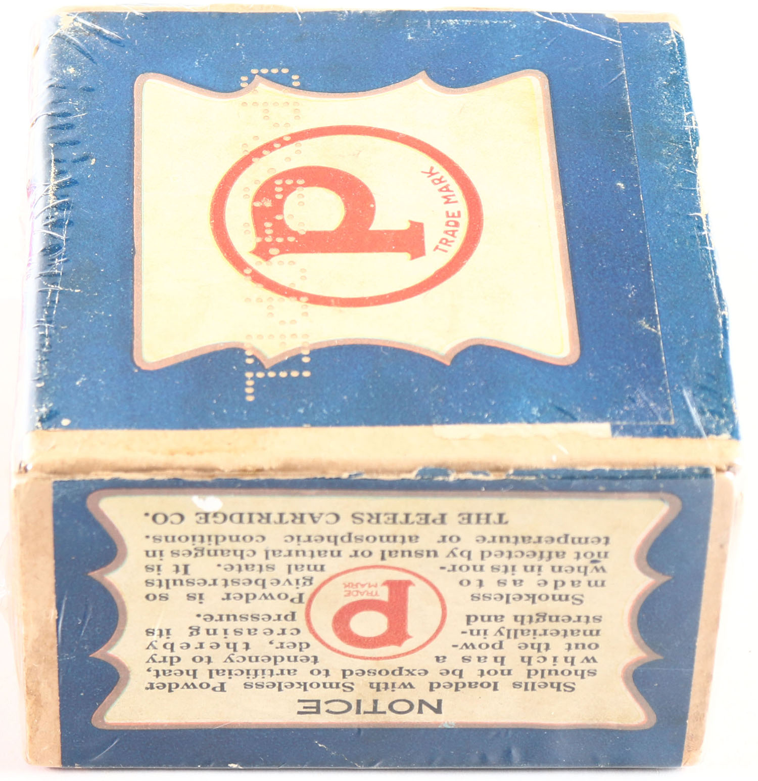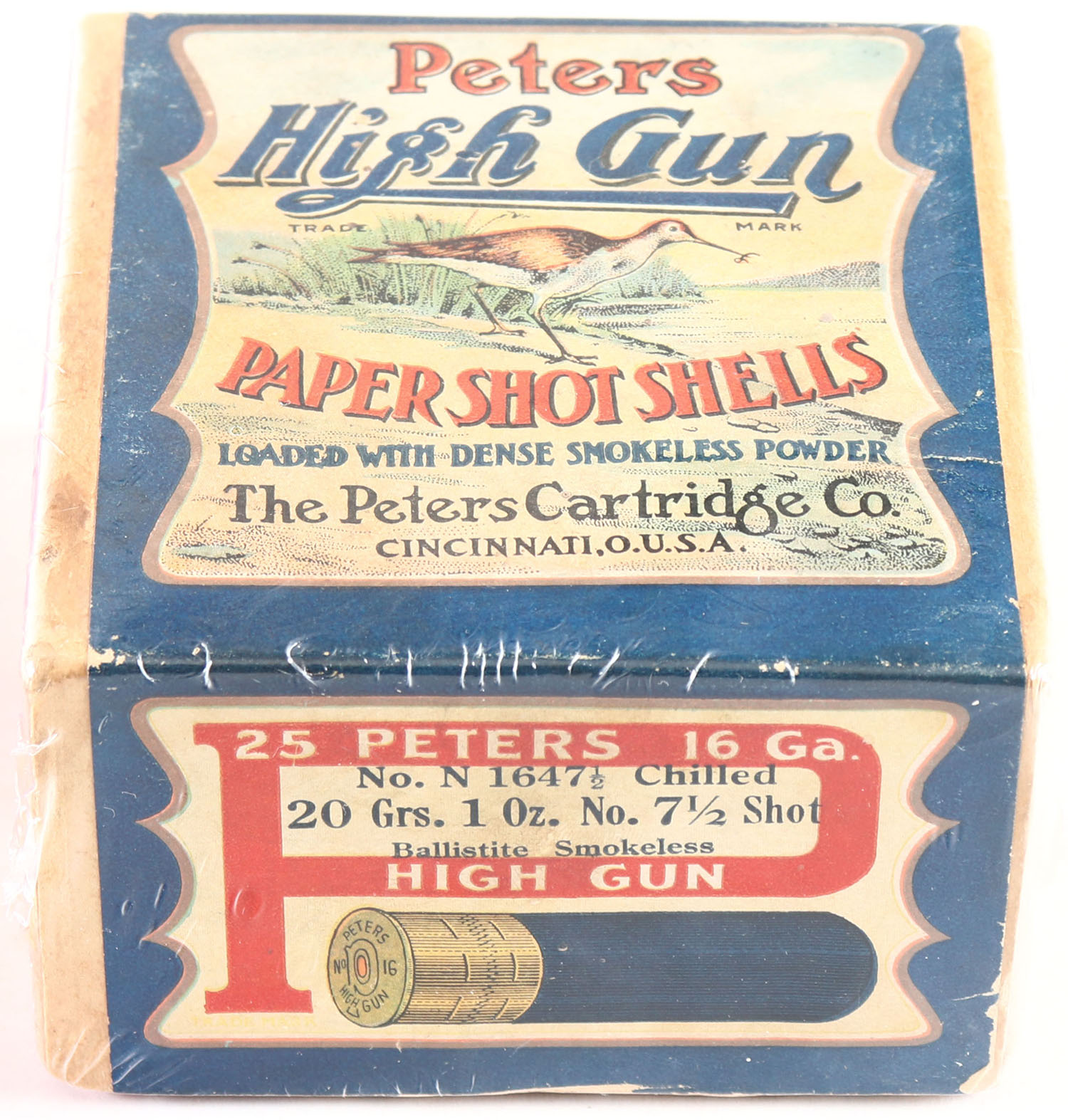 Peters Cart. Co., HIGH GUN, 16ga, 2pc., Empty, shot size 7 1/2, buff box with multi colored picture of Snipe, Loading: No. N 1647 1/2, 20 Grs., 1 Oz. No. 7 1/2 ch, Ballistic Smokeless, box is very solid with great colors. Grade: Excellent ++ - Value: 500 to 2000