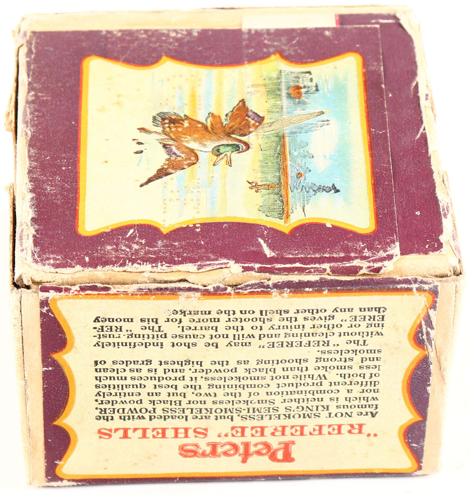 Peters Cart. Co., Referee, 20ga., 2pc., Empty, Shot size 6, No. C 226, 2 1/4 Drs., 8/4 Oz., No. 6 Shot, buff box with multi-colored label with flying ducks, box is solid with great color to label, box has scuffing & age soiling. Grade: Very Good ++ - Value: 250 to 500