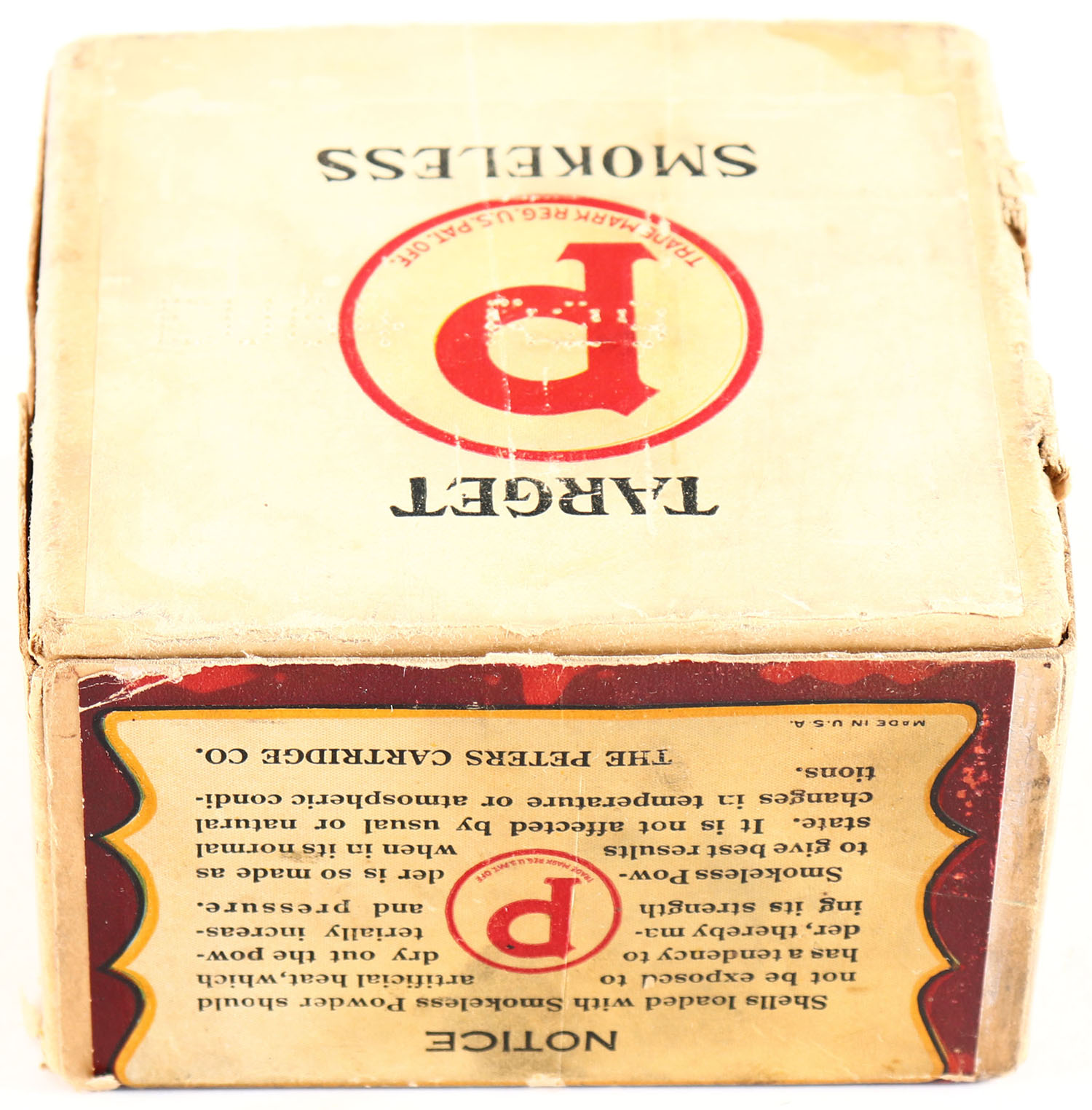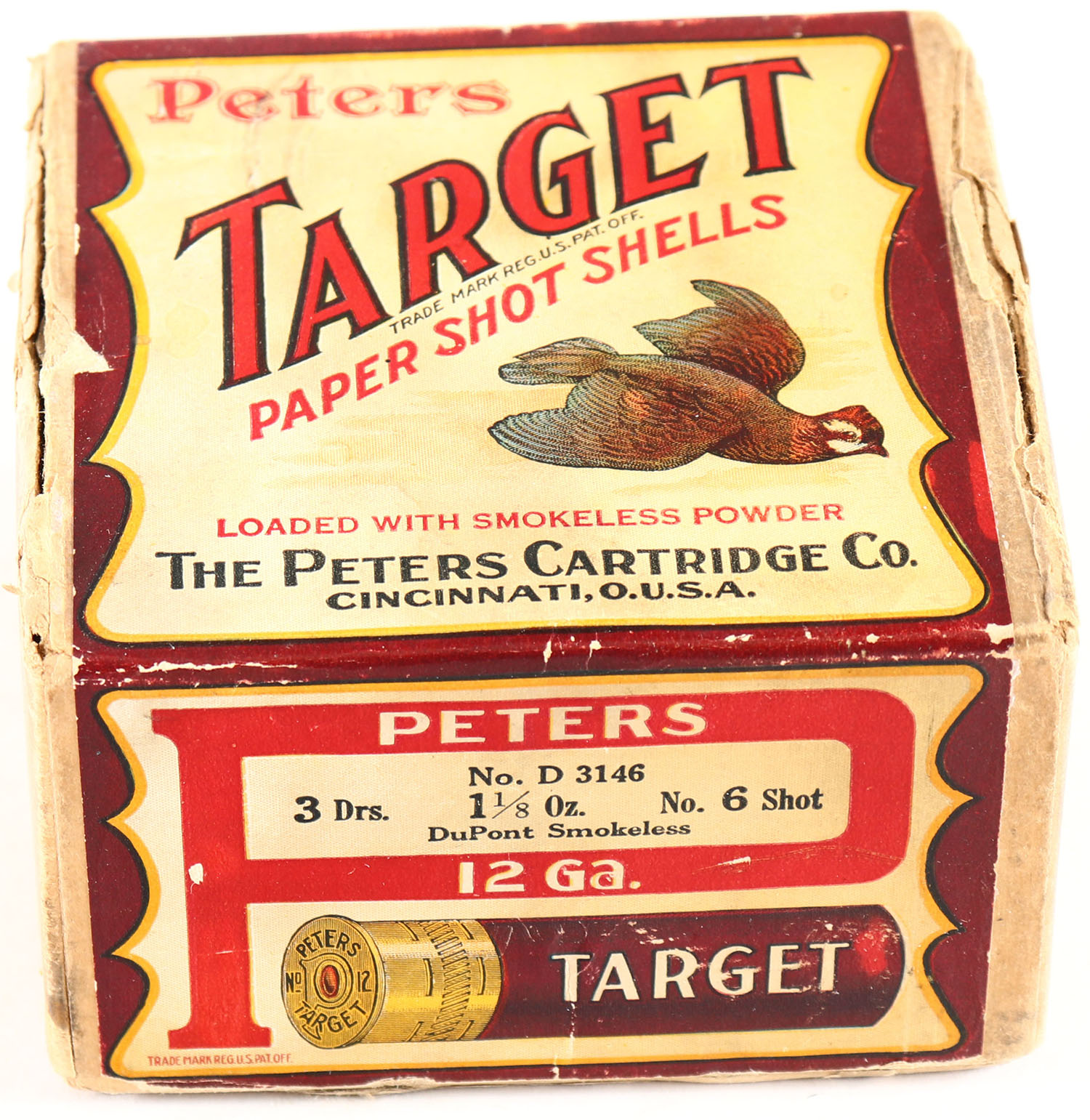 Peters Cart. Co., TARGET, 12ga., 2pc., Full, shot size 6, buff box with multi-colored label with Quail in flight, box has seam splits & age soiling with nice label, Shells are very good. Grade: Very Good - Value: 100 to 300