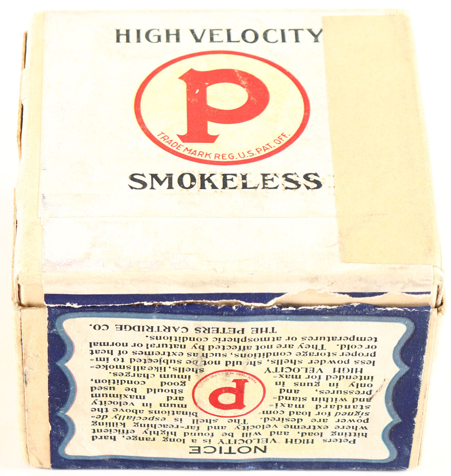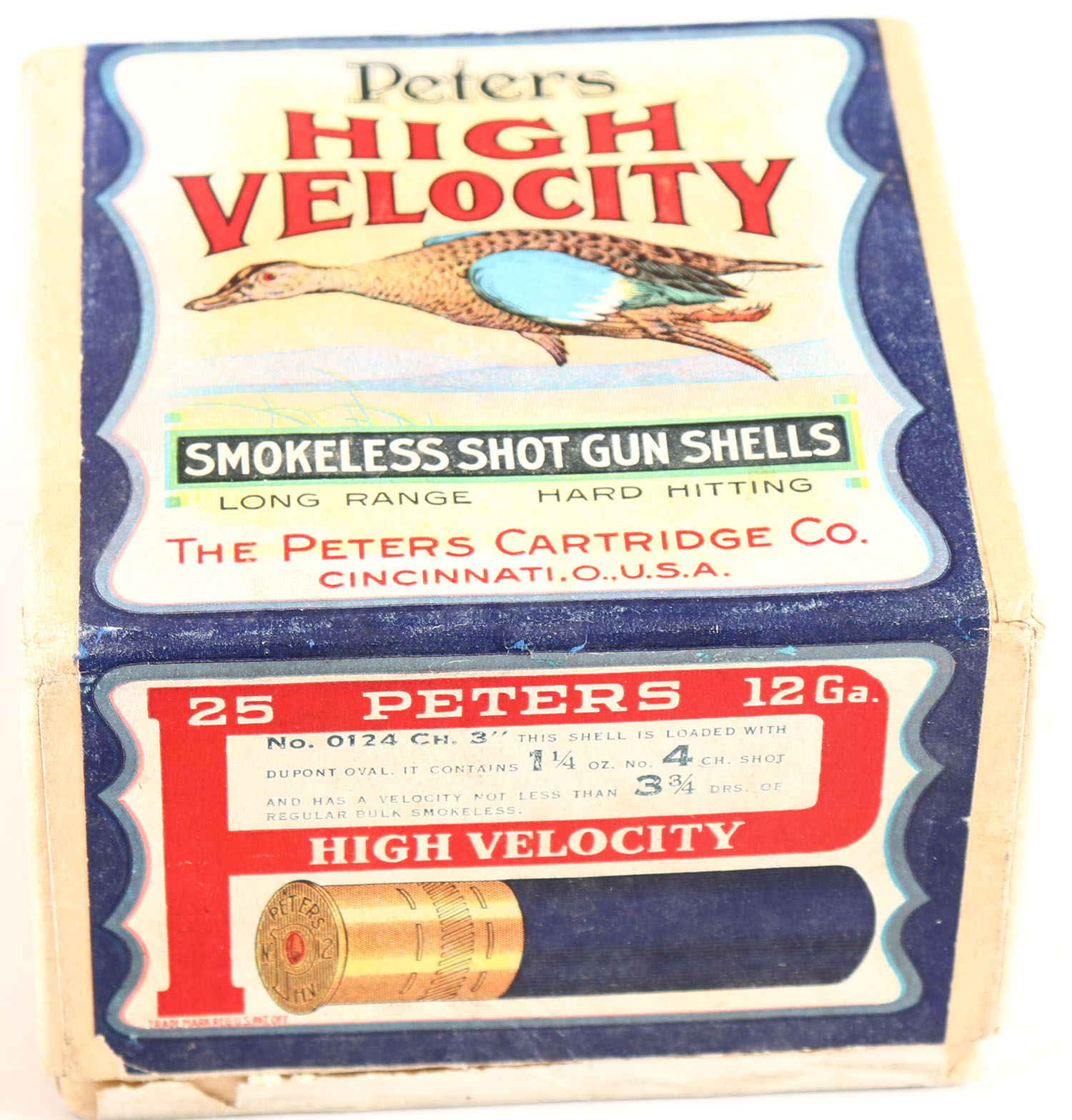 Peters Cart. Co., Blue Wing Teal, 12 Ga., 3'', 2pc., Full, shot size 4 CH, buff box with multi colored label that pictures Blue Wing Teal in flight, box is very solid has great label with great color, Shells are excellent. Grade: Excellent ++ - Value: 400 to 800