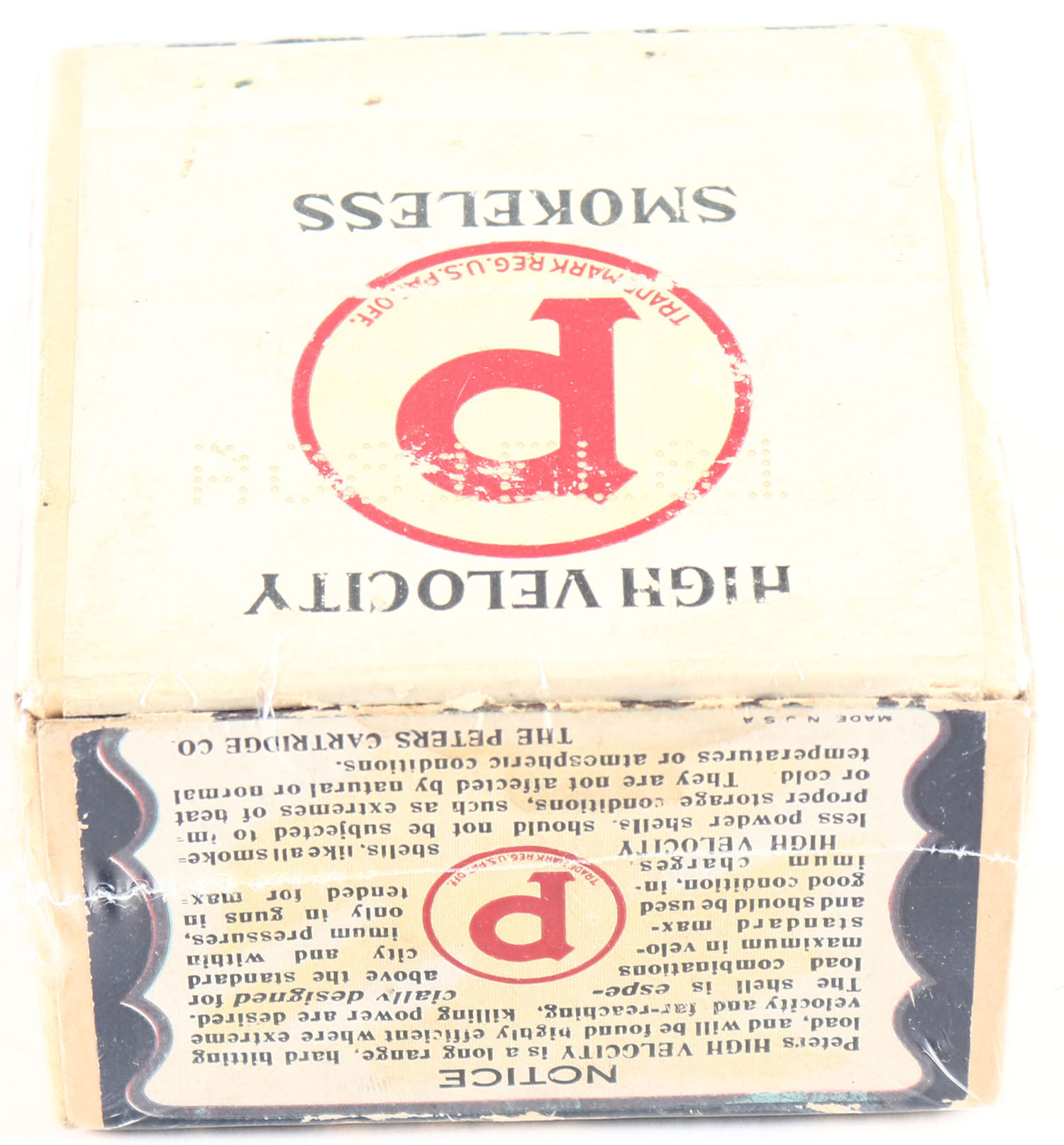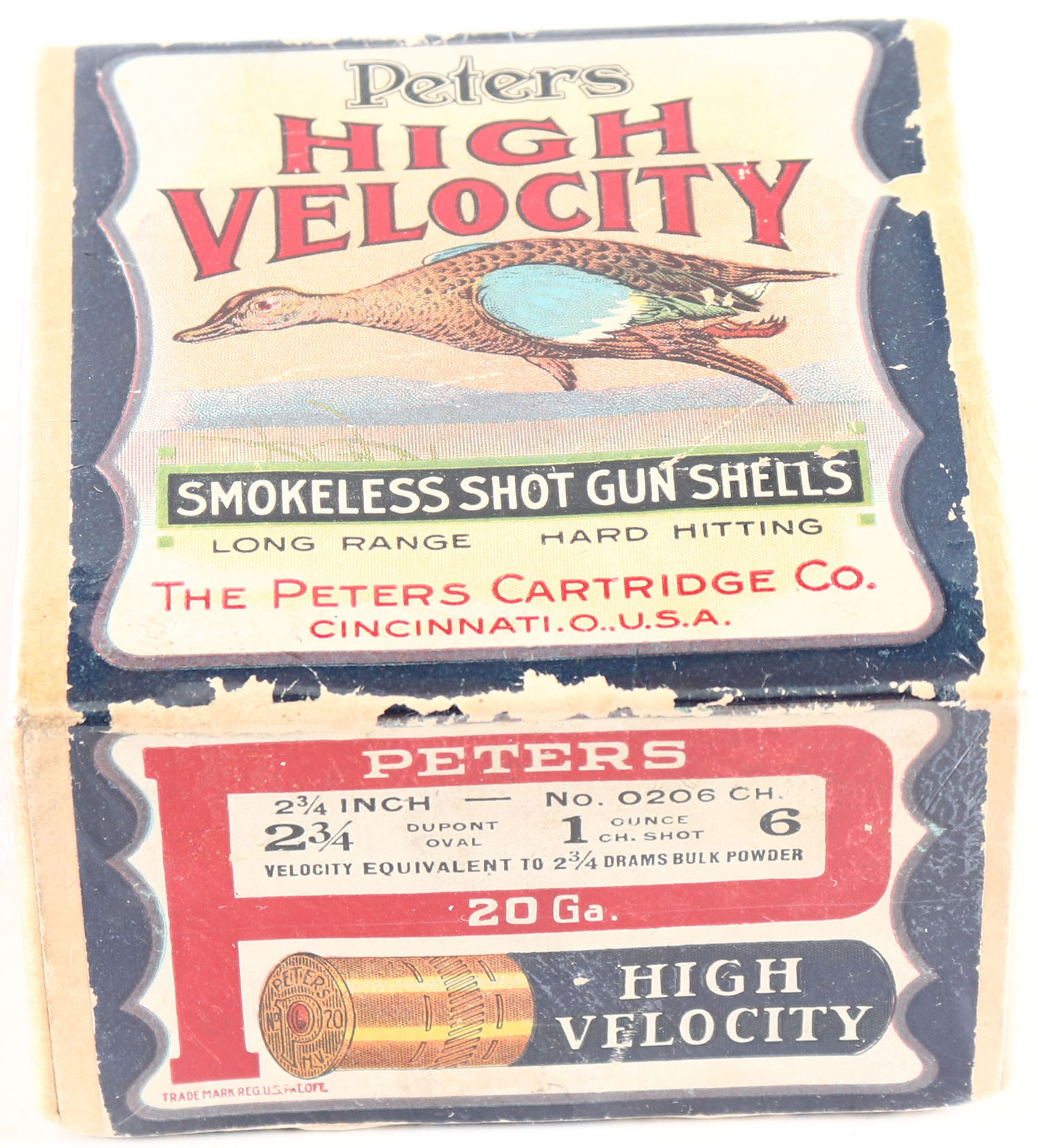 Peters Cart. Co., Blue Wing Teal, 20ga., 2 3/4'', 2pc., Empty, shot size 6 CH, buff box with multi colored label that pictures Blue Wing Teal in flight, box is solid with great label, box has very light scuffing. Grade: Excellent - Value: 100 to 300