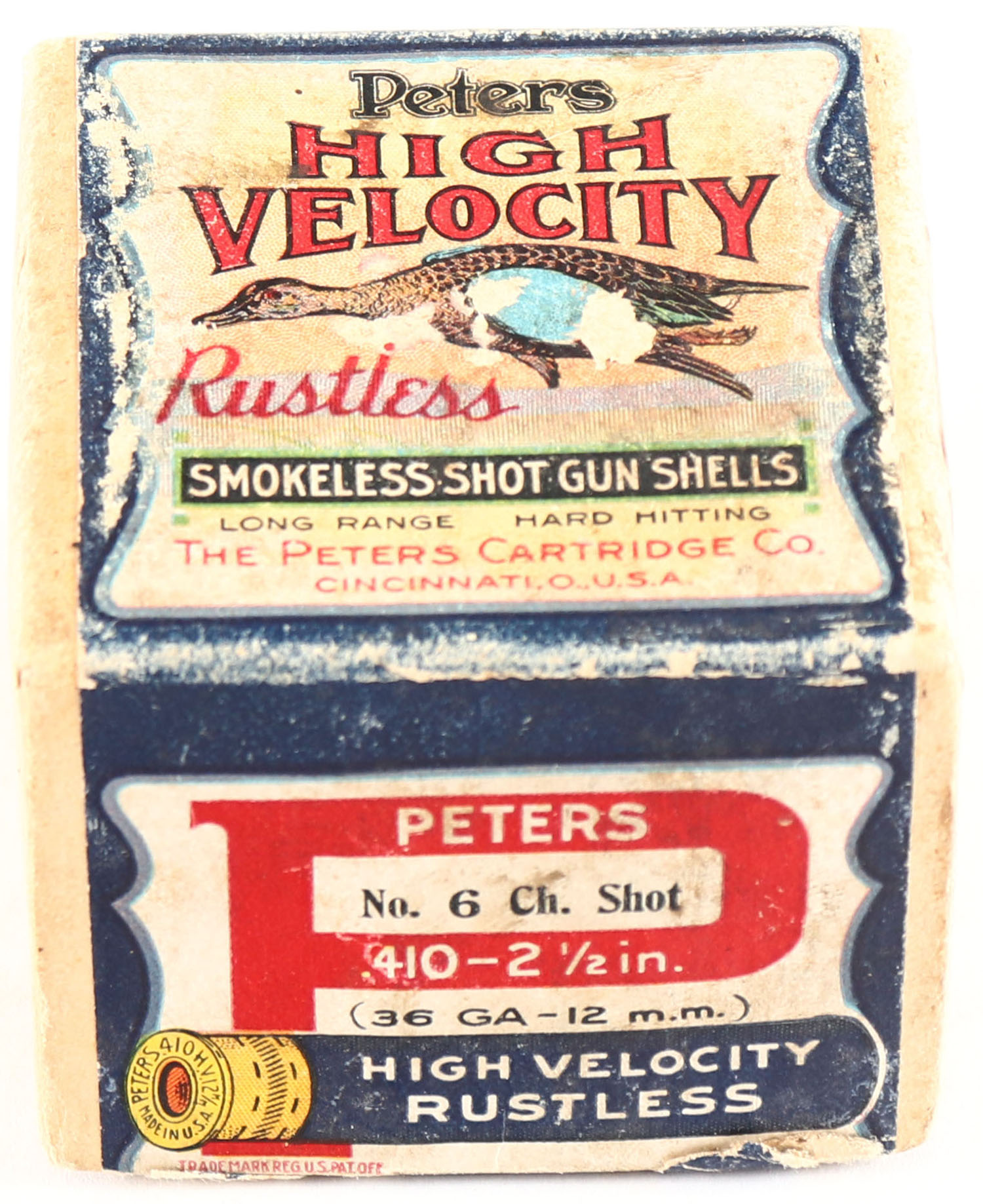 Peters Cart. Co., Blue Wing Teal, 410 Ga., 2 1/2'', 2pc., Empty, shot size 6CH, buff box with multi colored label that pictures Blue Wing Teal in flight, box has age soiling with light scuffing. Grade: Very Good ++ - Value: 200 to 500