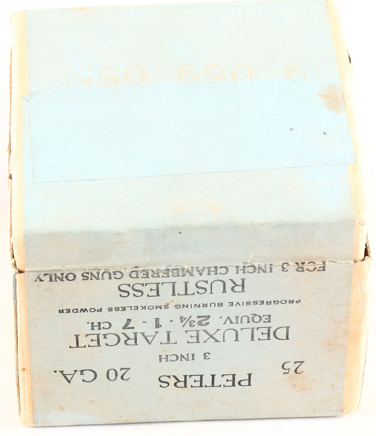 Peters Cart. Co., Deluxe Target, 20ga, 2pc., 3'', FULL & SEALED, shot size 7 CH., buff box with blue label, Loading: 2 3/4, 1 Oz. No. 7 Ch shot, Progressive Burning Smokeless Powder, box is very solid. Grade: Excellent ++ - Value: 100 to 300