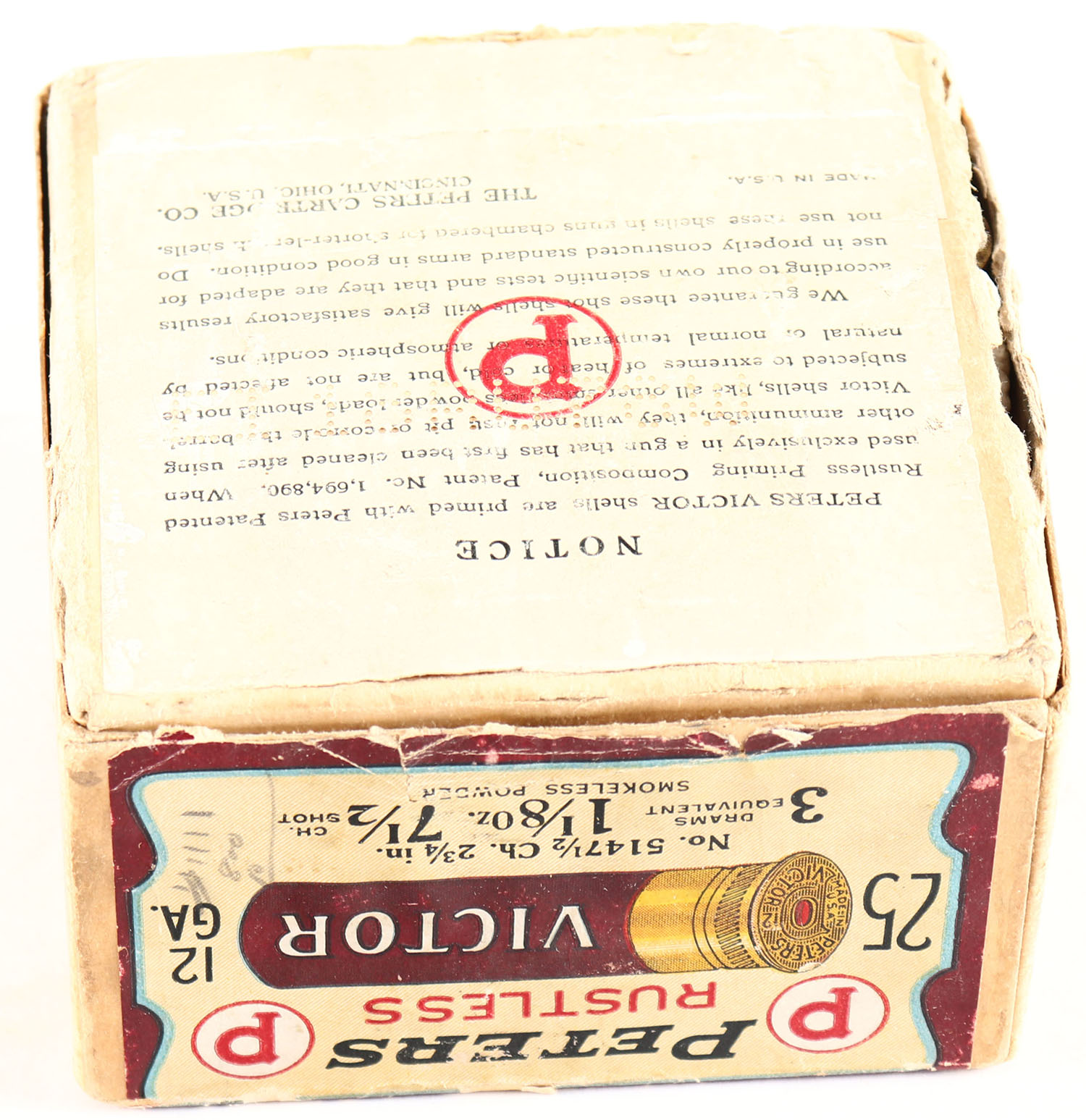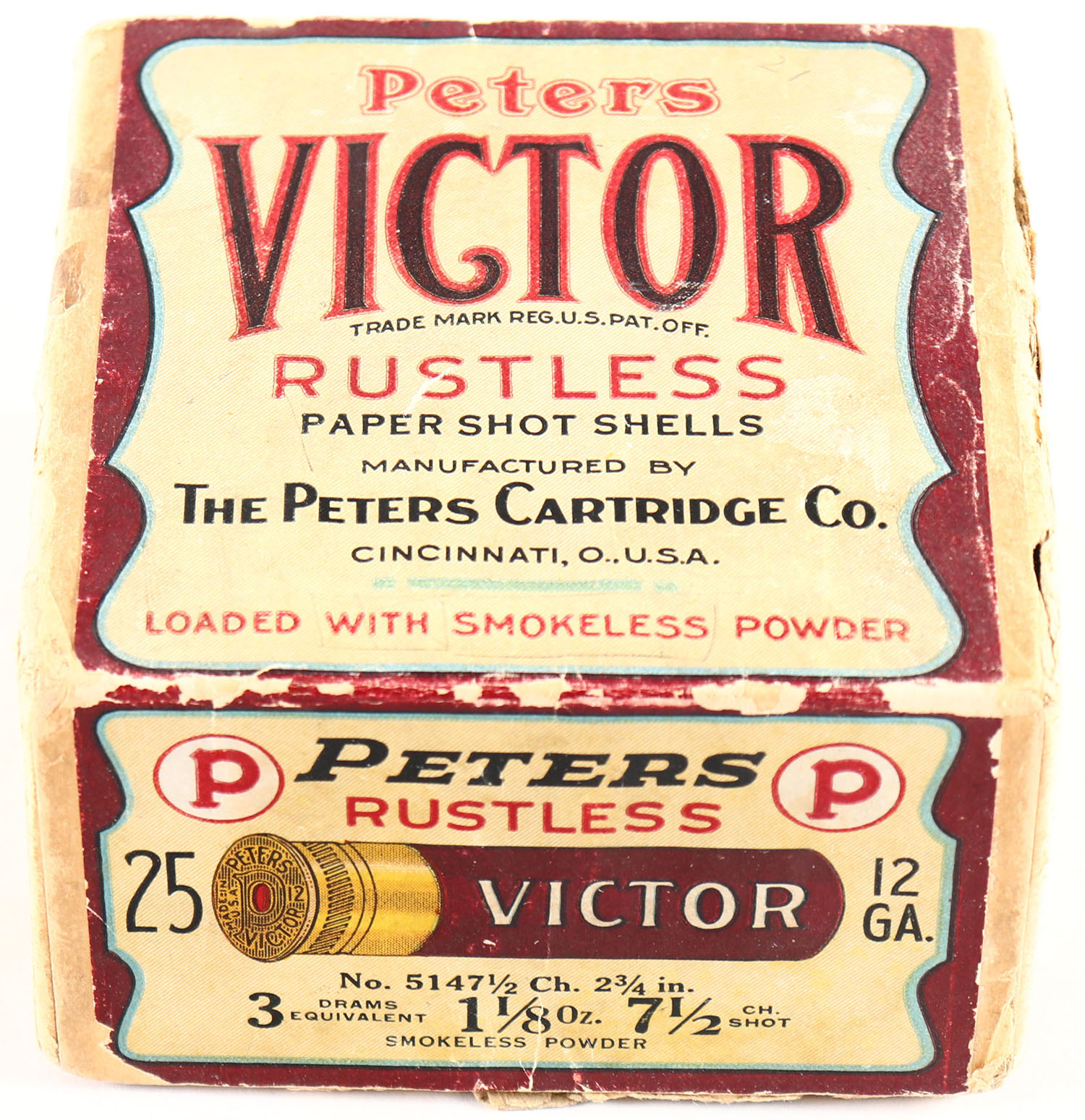 Peters Cart. Co., Victor, Rustless, 12ga., 2 3/4'', 2pc., Partial 21 rds., shot size 7 1/2, buff box with brown, cream & black label, box is solid with light soiling with a very good label, Shells are excellent. Grade: Very Good ++ - Value: 26 to 150