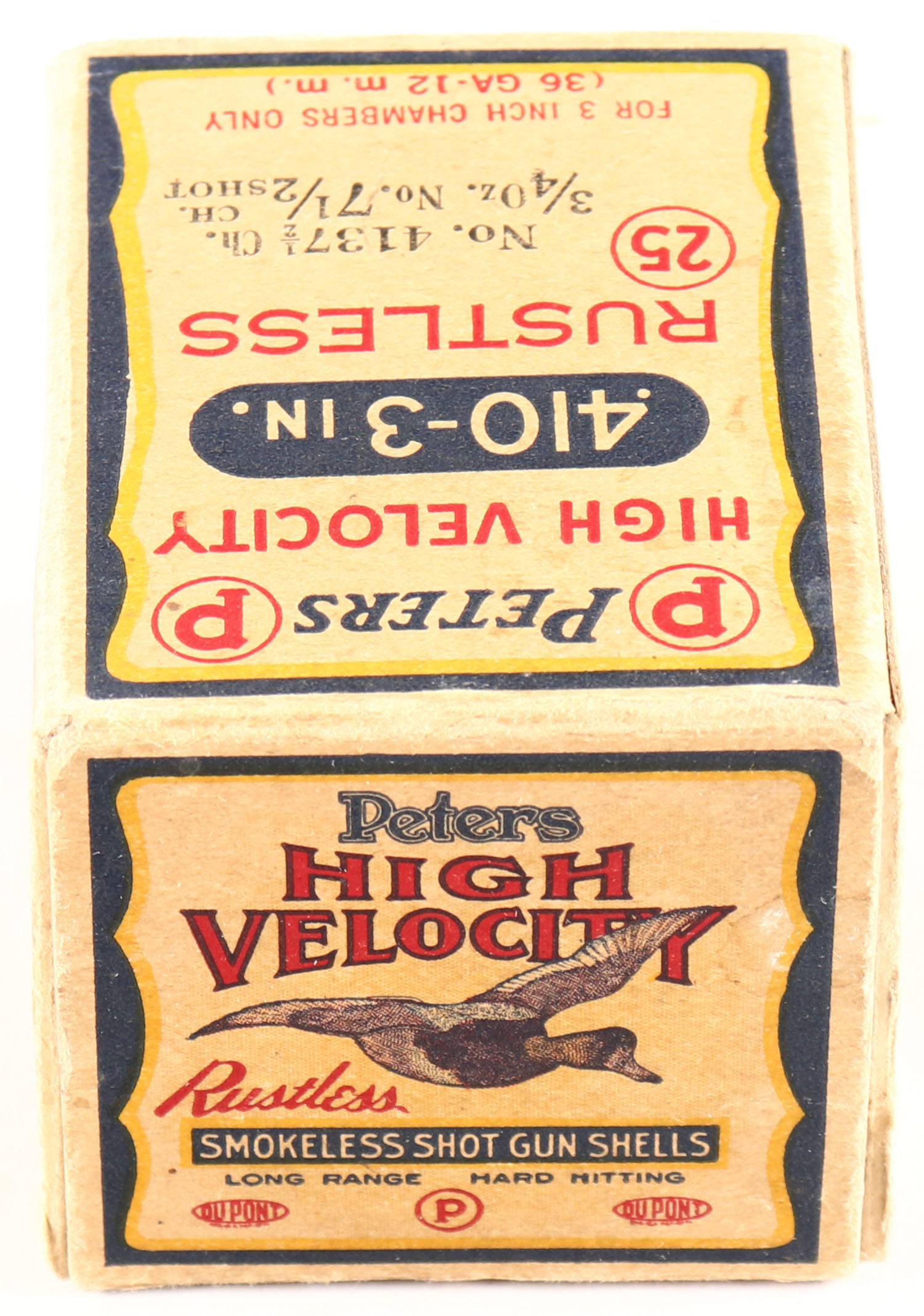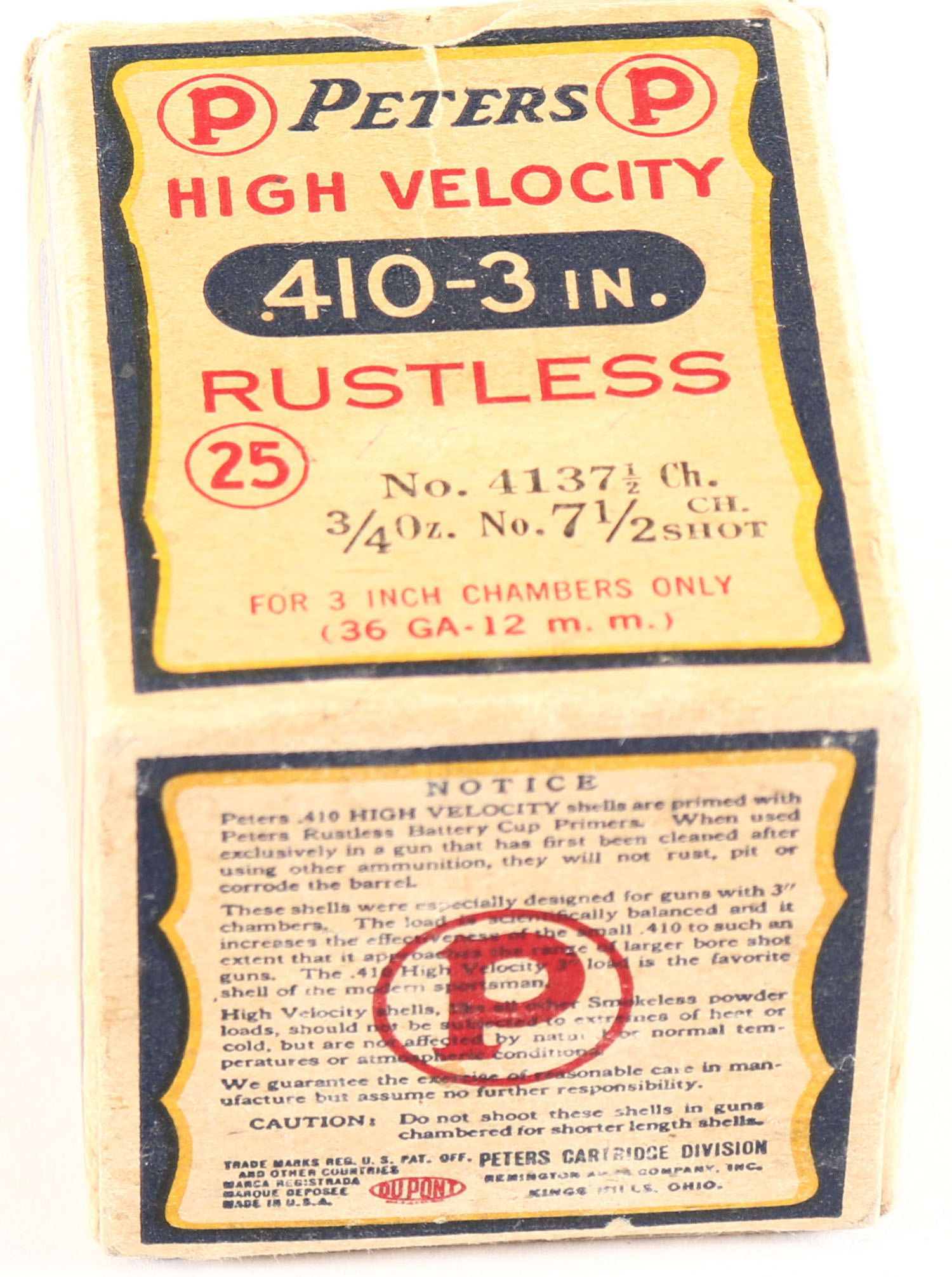 Peters Cart., High Velocity, 410ga., 3'', 1pc., Full, shot size 7 1/2 CH, multi colored box that pictures mallard flying out of the marsh grass, No Duvrock sides, box is very solid with great colors, shells are excellent, VERY RARE! Grade: Excellent + - Value: 400 to 1000